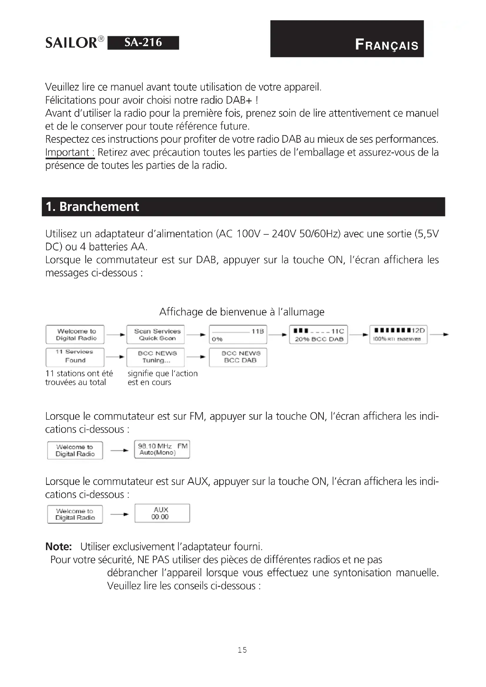 Utilisez un adaptateur d’alimentation (AC 100V – 240V 50/60Hz) avec une sortie (5,5V DC) ou 4 batteries AA. Lorsque le commutateur est sur DAB, appuyer sur la touche ON, l’écran affichera les messages ci-dessous : Affichage de bienvenue à l’allumage Lorsque le commutateur est sur FM, appuyer sur la touche ON, l’écran affichera les indi- cations ci-dessous : Lorsque le commutateur est sur AUX, appuyer sur la touche ON, l’écran affichera les indi- cations ci-dessous : Note: Utiliser exclusivement l’adaptateur fourni. Pour votre sécurité, NE PAS utiliser des pièces de différentes radios et ne pas débrancher l’appareil lorsque vous effectuez une syntonisation manuelle. Veuillez lire les conseils ci-dessous : 11 stations ont été trouvées au totalsignifie que l’action est en coursFRANÇAIS