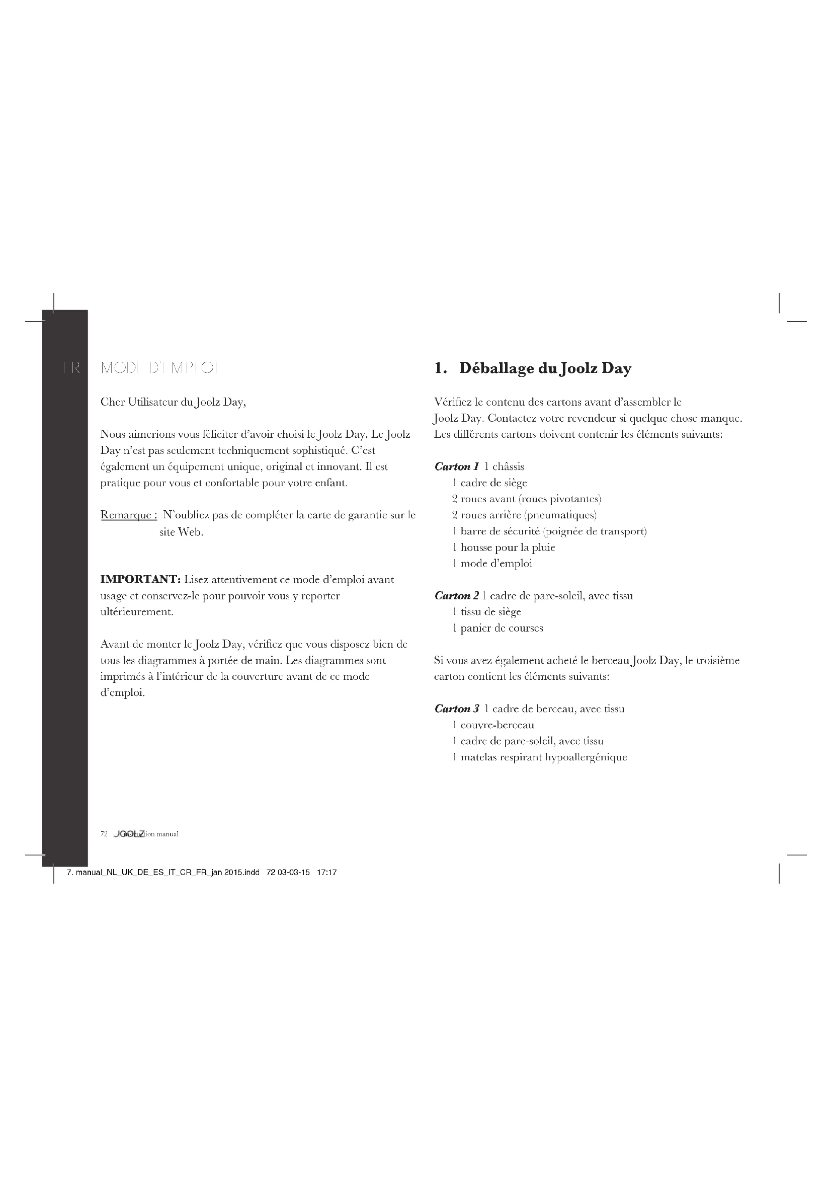 MODE D'EMPLOI CherUtilisateurduJoolzDay, Nousaimerionsvousféliciterd’avoirchoisileJoolzDay.LeJoolz Dayn’estpasseulementtechniquementsophistiqué.C’est égalementunéquipementunique,originaletinnovant.Ilest pratiquepourvousetconfortablepourvotreenfant. Remarque:N’oubliezpasdecompléterlacartedegarantiesurle site Web. IMPORTANT:Lisezattentivementcemoded’emploiavant usageetconservez-lepourpouvoirvousyreporter ultérieurement. AvantdemonterleJoolzDay,vériezquevousdisposezbiende touslesdiagrammesàportéedemain.Lesdiagrammessont imprimésàl’intérieurdelacouvertureavantdecemode d’emploi.