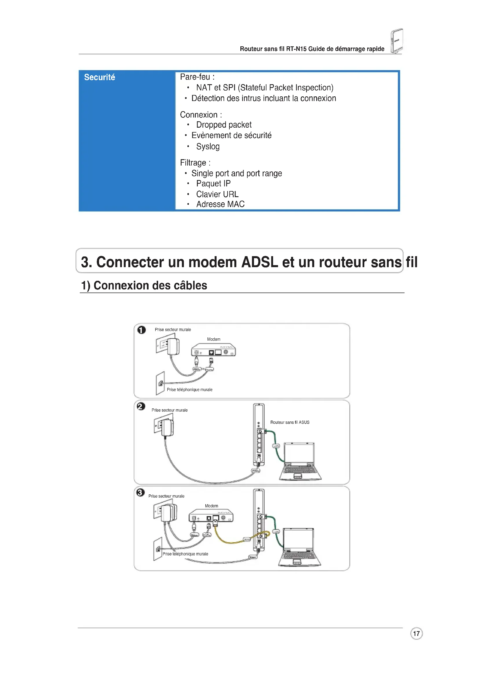 ModemWall telephone outletWallpoweroutletPhonePowerWallpoweroutletASUSWirelessRouterModemWall telephone outletPhonePowerPower LAN WallpoweroutletPowerWAN LAN Prise secteur muraleModemPrisetéléphoniquemuralePrise secteur muraleRouteursanslASUSAlim.Prise secteur muraleModemPrisetéléphoniquemuraleAlim.Alim. Tél. Alim. Tél.Routeur sans l RT-N15 Guide de démarrage rapide