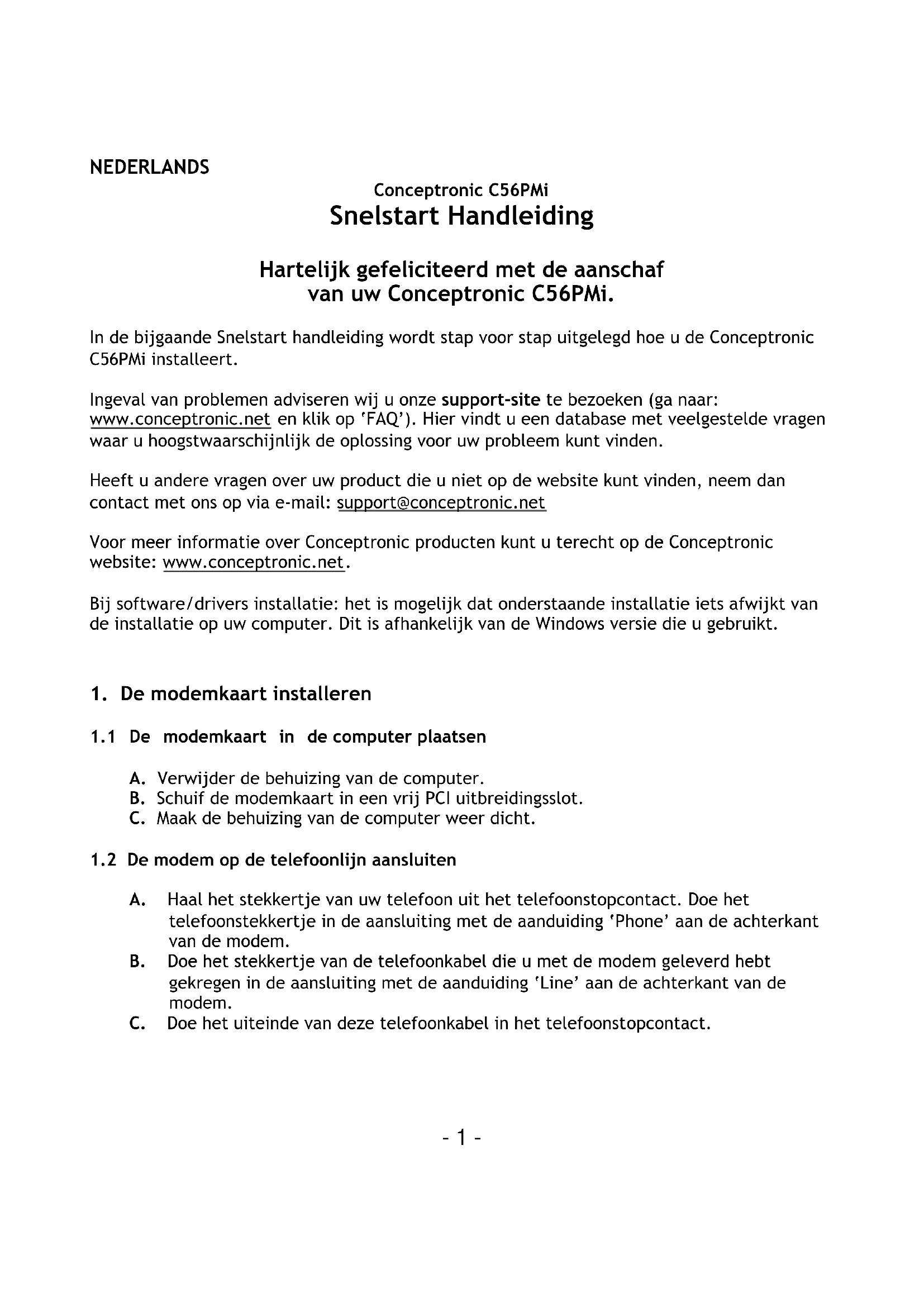 Conceptronic C56PMi Guide de démarrage rapide Nous vous félicitons d'avoir acheté le C56PMi de Conceptronic. Le Guide d'Installation du Matériel ci-joint vous expliquera pas à pas comment installer C56PMi de Conceptronic. En cas de problèmes, nous vous recommandons de vous adresser à notre service technique (allez à www.conceptronic.net et cliquez sur « support »). Vous trouverez dans cette section la Base de Données des Foires Aux Questions. Si vous avez d’autres questions concernant votre produit et que vous ne trouvez pas la solution sur notre site web, contactez-nous par e-mail : support@conceptronic.net