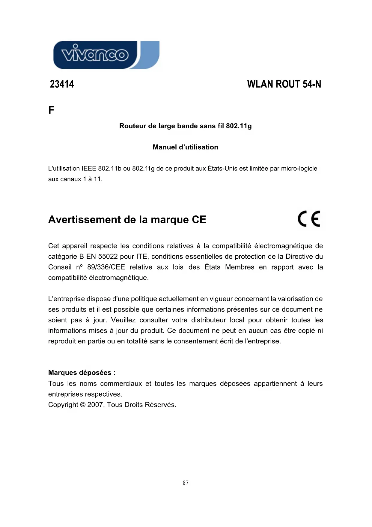 Routeur de large bande sans fil 802.11g L'utilisation IEEE 802.11b ou 802.1 aux canaux 1 à 11. Avertissement de la marque CE Cet appareil respecte les conditions relati ssentielles de protection de la Directive du des États Membres en rapport avec la atibilité électromagnétique. e dispose d'une politique actuellement en vigueur concernant la valorisation de s et il est possible que certaines informations présentes sur ce document ne as à jour. Veuillez consulter votre distributeur local pour obtenir toutes les oduit. Ce document ne peut en aucun cas être copié ni artie ou en totalité sans le consentement écrit de l'entreprise. les marques déposées appartiennent à leurs Tous Droits Réservés.