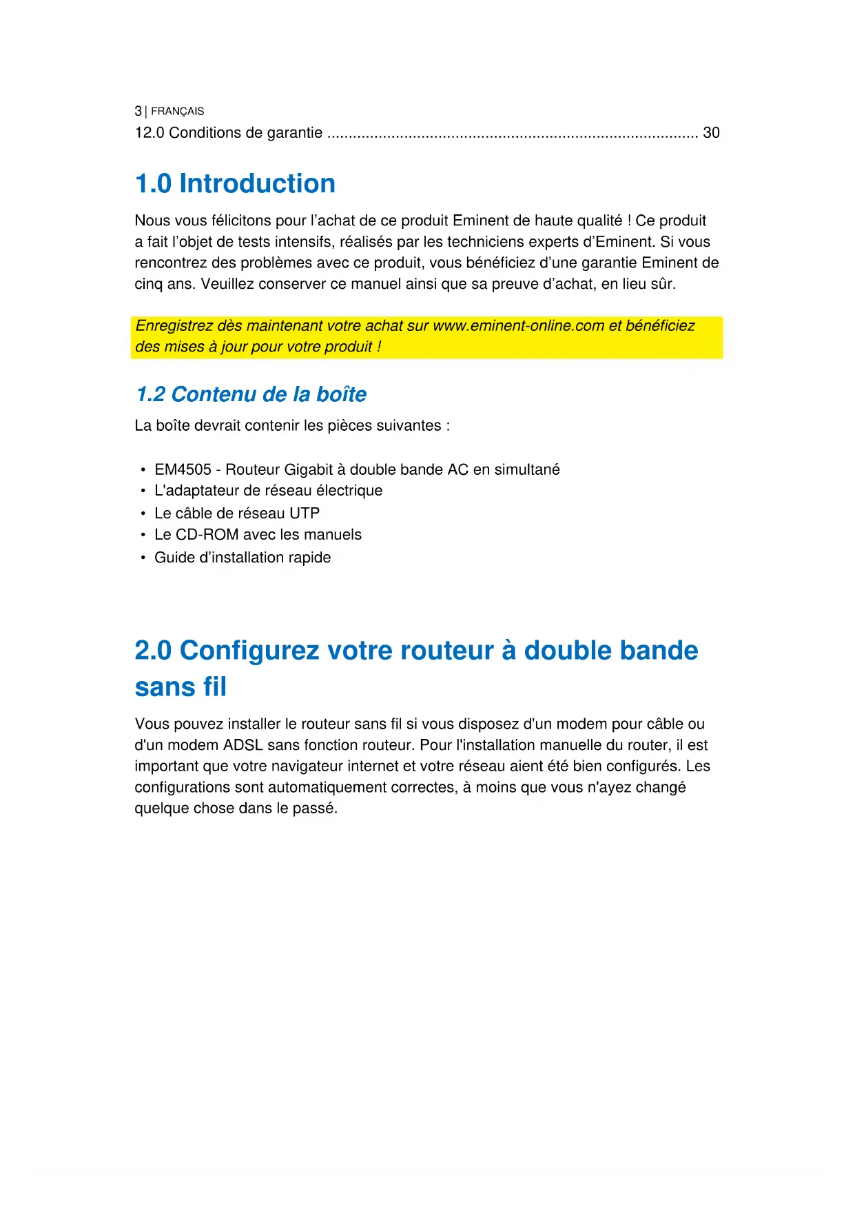 En raison des lois, directives et régulations mises en place par le parlement Européen, plusieurs appareils (sans fils) peuvent être soumis a des limitations concernant leur usage dans certains membres de l'Union Européenne. Dans certains membres de l'Union Européenne l'usage de tels appareils peut être interdit. Contactez votre gouvernement ( local) pour plus d'informations concernant ces limitations. Suivez toujours les instructions du mode d'emploi, spécialement quand il concerne des produits qui doivent être assemblés. Attention: Dans la plupart des cas ceci concerne des produits électriques. Une mauvaise ou incorrecte utilisation peut conduire à de(sévères) blessures! La réparation du produit doit être effectuée par un agent qualifié de Eminent: La garantie prend fin dès le moment oú les produits ont étés réparés par le client et/ou mals utilisés. Pour de plus amples informations sur les conditions de garantie, merci de visiter notre site internet www.eminent-online.com/warranty. Les manuels d'Eminent ont été écris avec une grande attention. Néanmoins et à cause des améliorations technologiques, il peut arriver que les manuels ne contiennent pas les informations les plus récentes. Si vous rencontrez la moindre difficulté avec le manuel imprimé ou si vous n'y trouvez pas de solutions à vos problèmes, nous vous invitons à visiter notre site Internet www.eminent-online.com pour consulter les dernières mises à jours relatives à nos manuels. Aussi, vous trouverez dans notre rubrique FAQ les questions les plus fréquemment posées par nos clients. Nous vous recommandons vivement de consulter notre FAQ. Très souvent les réponses à vos questions s'y trouvent.30