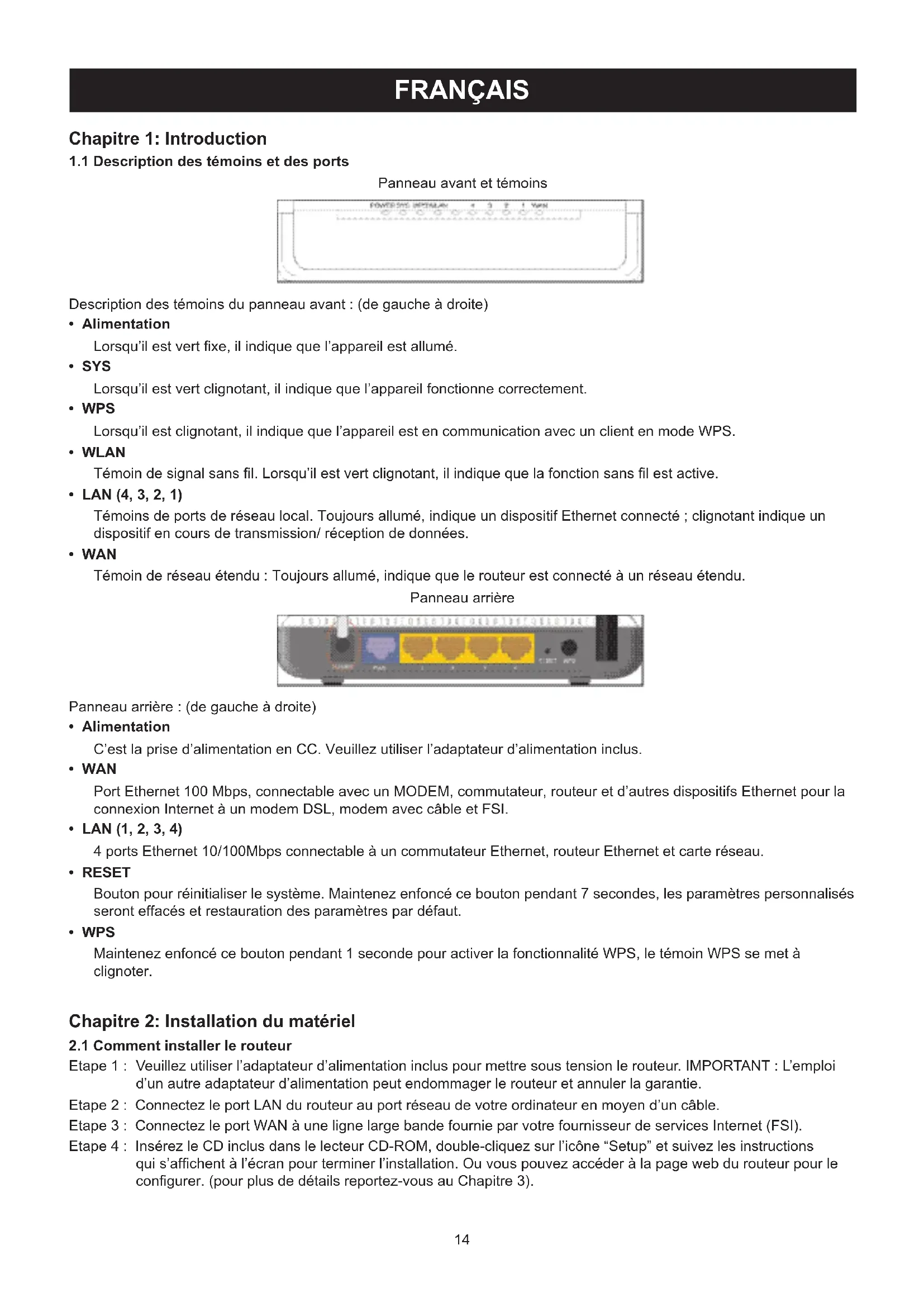 Etape 1 : Veuillez utiliser l’adaptateur d’alimentation inclus pour mettre sous tension le routeur. IMPORTANT : L’emploi d’un autre adaptateur d’alimentation peut endommager le routeur et annuler la garantie. Etape 2 : Connectez le port LAN du routeur au port réseau de votre ordinateur en moyen d’un câble. Etape 3 : Connectez le port WAN à une ligne large bande fournie par votre fournisseur de services Internet (FSI). Etape 4 : Insérez le CD inclus dans le lecteur CD-ROM, double-cliquez sur l’icône “Setup” et suivez les instructions qui s’affichent à l’écran pour terminer l’installation. Ou vous pouvez accéder à la page web du routeur pour le configurer. (pour plus de détails reportez-vous au Chapitre 3).15