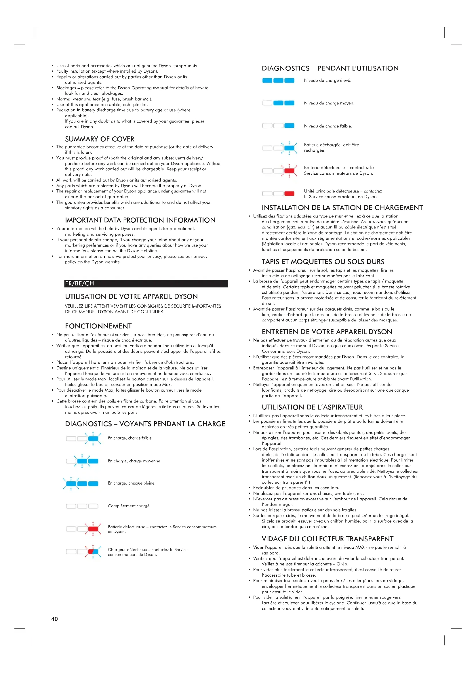 Si vous avez des questions sur votre aspirateur Dyson, veuillez contacter le Service Consommateurs Dyson en vous munissant du numéro de série de votre appareil, de vos coordonnées, du lieu et de la date d’achat de votre aspirateur ou contactez Dyson en utilisant notre site internet. La plupart des questions peuvent être résolues par téléphone par un de nos techniciens du Service Consommateurs Dyson. Si votre aspirateur nécessite une réparation, veuillez contacter le Service Consommateurs Dyson pour détailler les options possibles. Si votre aspirateur est sous garantie et si la réparation est prise en charge, il sera réparé sans frais.
