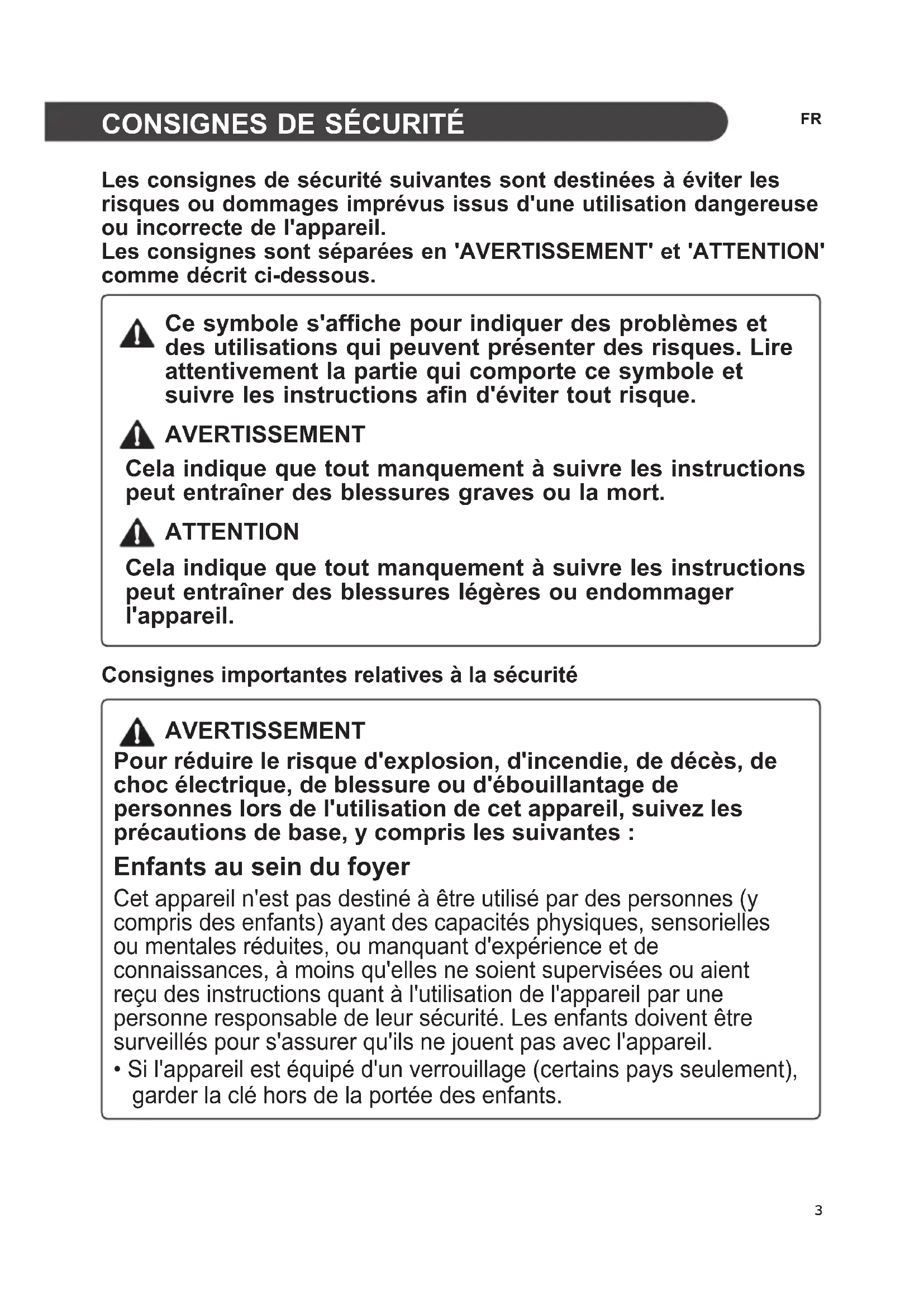 Les consignes de sécurité suivantes sont destinées à éviter les risques ou dommages imprévus issus d'une utilisation dangereuse ou incorrecte de l'appareil. Les consignes sont séparées en 'AVERTISSEMENT' et 'ATTENTION' comme décrit ci-dessous. Ce symbole s'affiche pour indiquer des problèmes et des utilisations qui peuvent présenter des risques. Lire attentivement la partie qui comporte ce symbole et suivre les instructions afin d'éviter tout risque. AVERTISSEMENT Cela indique que tout manquement à suivre les instructions peut entraîner des blessures graves ou la mort. ATTENTION Cela indique que tout manquement à suivre les instructions peut entraîner des blessures légères ou endommager l'appareil. Consignes importantes relatives à la sécurité AVERTISSEMENT Pour réduire le risque d'explosion, d'incendie, de décès, de choc électrique, de blessure ou d'ébouillantage de personnes lors de l'utilisation de cet appareil, suivez les précautions de base, y compris les suivantes : Enfants au sein du foyer Cet appareil n'est pas destiné à être utilisé par des personnes (y compris des enfants) ayant des capacités physiques, sensorielles ou mentales réduites, ou manquant d'expérience et de connaissances, à moins qu'elles ne soient supervisées ou aient reçu des instructions quant à l'utilisation de l'appareil par une personne responsable de leur sécurité. Les enfants doivent être surveillés pour s'assurer qu'ils ne jouent pas avec l'appareil.