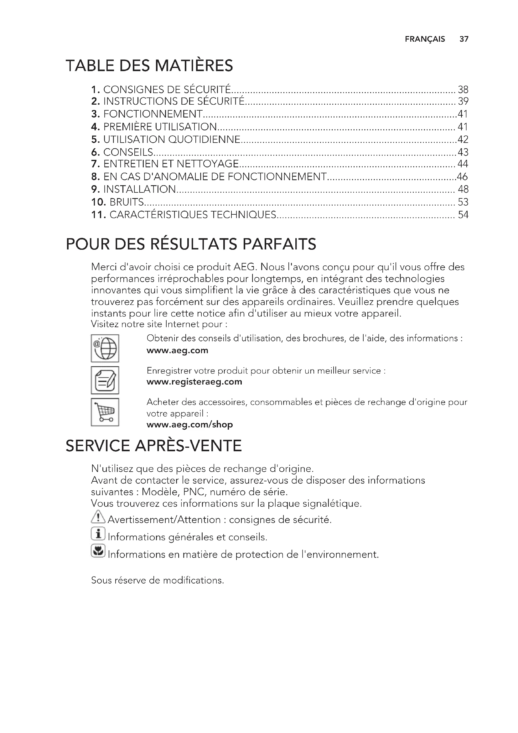 Merci d'avoir choisi ce produit AEG. Nous l'avons conçu pour qu'il vous offre des performances irréprochables pour longtemps, en intégrant des technologies innovantes qui vous simplifient la vie grâce à des caractéristiques que vous ne trouverez pas forcément sur des appareils ordinaires. Veuillez prendre quelques instants pour lire cette notice afin d'utiliser au mieux votre appareil. Visitez notre site Internet pour : Obtenir des conseils d'utilisation, des brochures, de l'aide, des informations : www.aeg.com Enregistrer votre produit pour obtenir un meilleur service : www.registeraeg.com Acheter des accessoires, consommables et pièces de rechange d'origine pour votre appareil : www.aeg.com/shop