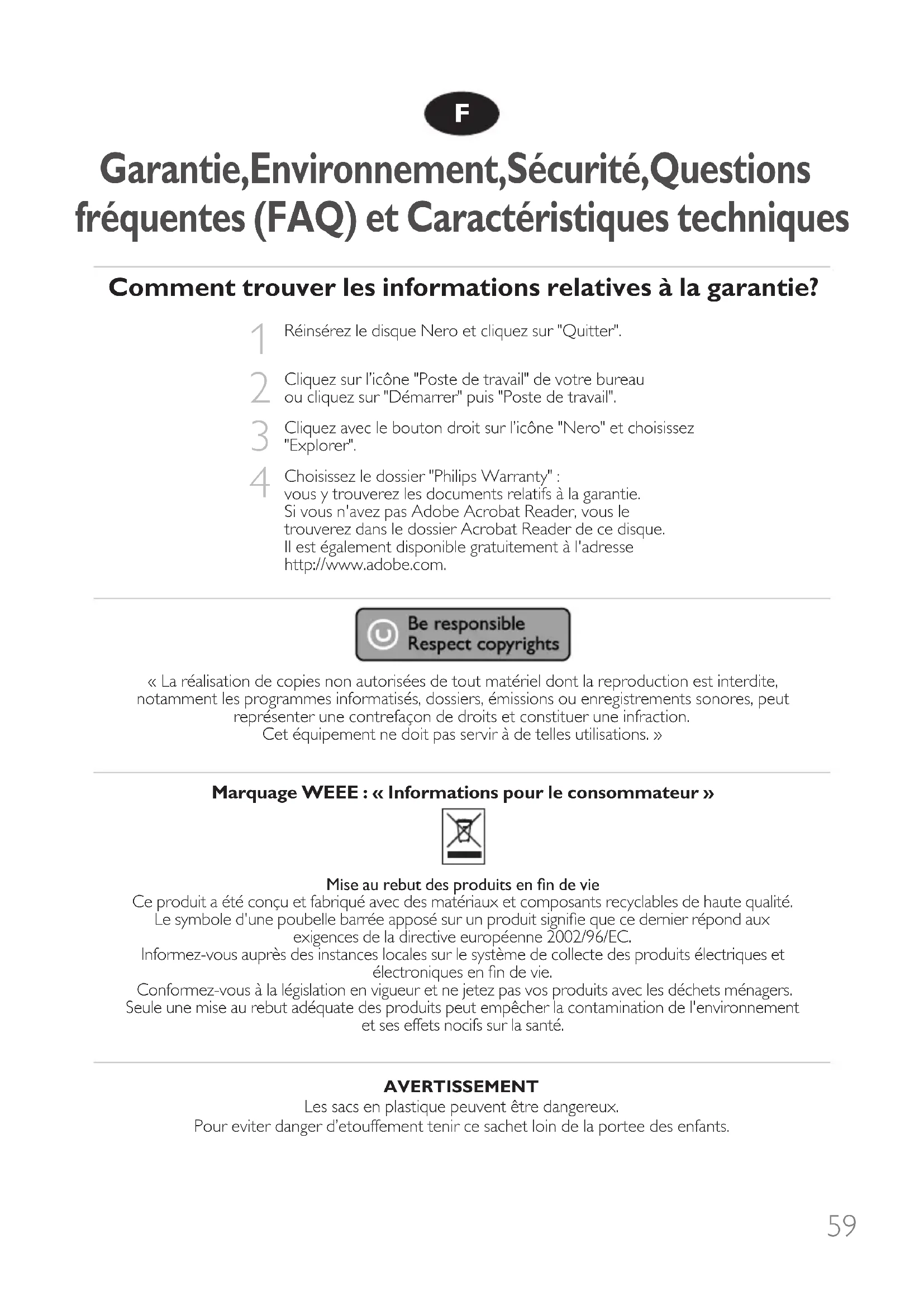 Choisissez le dossier "Philips Warranty" : vous y trouverez les documents relatifs à la garantie. Si vous n'avez pas Adobe Acrobat Reader, vous le trouverez dans le dossier Acrobat Reader de ce disque. Il est également disponible gratuitement à l'adresse http://www.adobe.com. « La réalisation de copies non autorisées de tout matériel dont la reproduction est interdite, notamment les programmes informatisés, dossiers, émissions ou enregistrements sonores, peut représenter une contrefaçon de droits et constituer une infraction. Cet équipement ne doit pas servir à de telles utilisations. » Marquage WEEE : « Informations pour le consommateur » Mise au rebut des produits en fin de vie Ce produit a été conçu et fabriqué avec des matériaux et composants recyclables de haute qualité. Le symbole d'une poubelle barrée apposé sur un produit signifie que ce dernier répond aux exigences de la directive européenne 2002/96/EC. Informez-vous auprès des instances locales sur le système de collecte des produits électriques et électroniques en fin de vie. Conformez-vous à la législation en vigueur et ne jetez pas vos produits avec les déchets ménagers. Seule une mise au rebut adéquate des produits peut empêcher la contamination de l'environnement et ses effets nocifs sur la santé. AVERTISSEMENT Les sacs en plastique peuvent être dangereux. Pour eviter danger d’etouffement tenir ce sachet loin de la portee des enfants. Garantie,Environnement,Sécurité,Questions fréquentes (FAQ) et Caractéristiques techniques F60 Questions fréquentes (FAQ) Question 1 : Je possède un PC fonctionnant sous Windows 98 Deuxième Édition sans lecteur de CD-ROM, mais je possède aussi un autre PC. Comment installer les pilotes ?