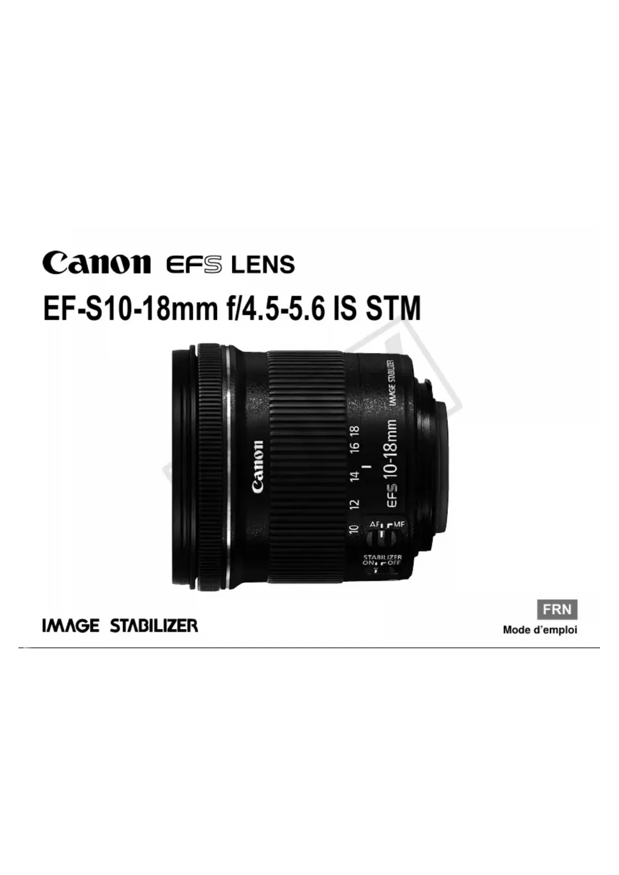 EF-S10-18mm f/4.5-5.6 IS STM Mode d’emploi FRN COPY Nous vous remercions d’avoir choisi un produit Canon. Le Canon EF-S10-18mm f/4,5-5,6 IS STM est un objectif zoom ultra grand angle de haute performance qui rend la réalisation de vidéos facile. L’objectif est équipé d’un stabilisateur d’image et a été conçu pour les appareils photo EOS compatibles avec les objectifs EF-S*.