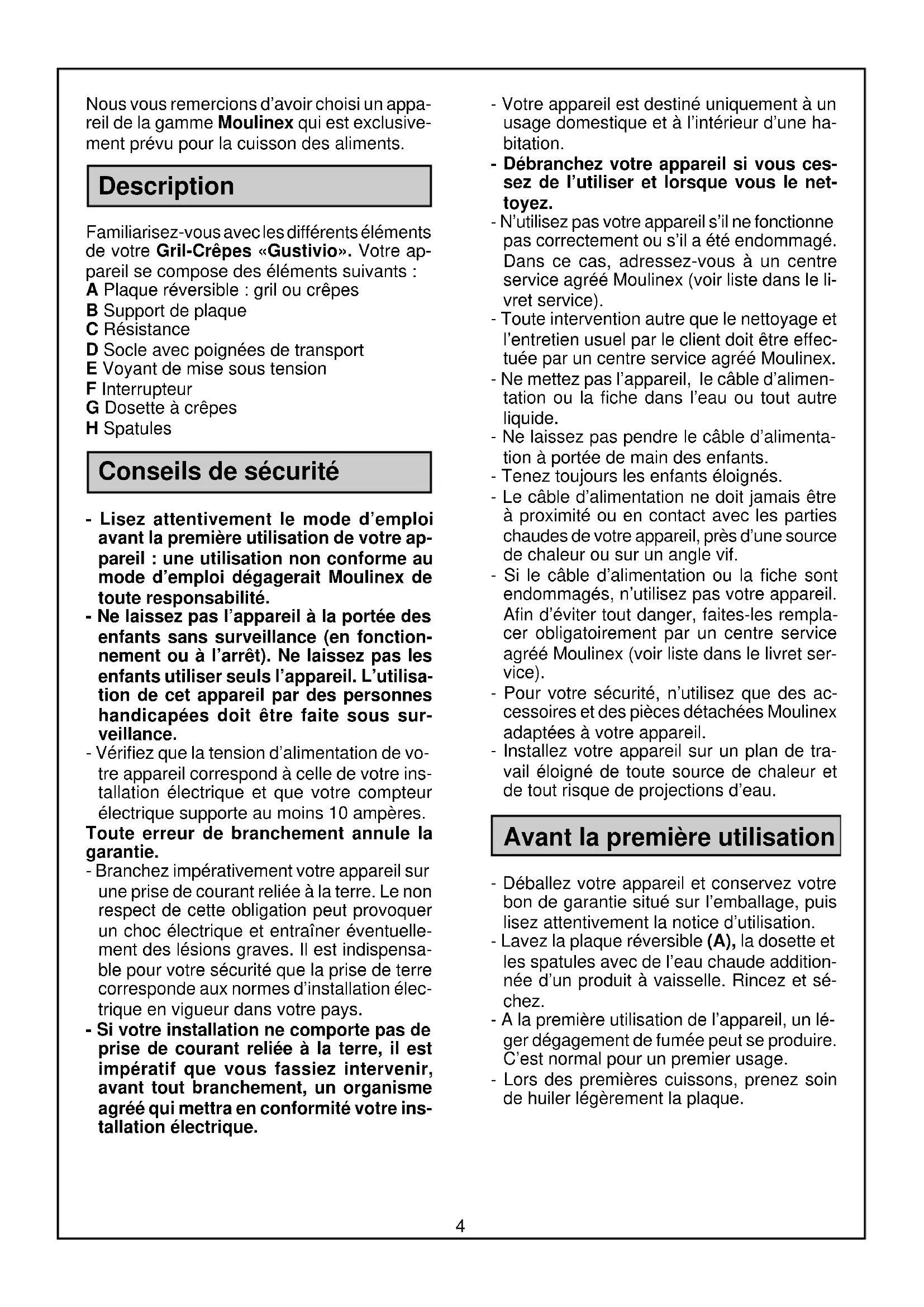 Nous vous remercions d’avoir choisi un appa- reil de la gamme Moulinex qui est exclusive- ment prévu pour la cuisson des aliments. Description Familiarisez-vous avec les différents éléments de votre Gril-Crêpes «Gustivio». Votre ap- pareil se compose des éléments suivants : A Plaque réversible : gril ou crêpes B Support de plaque C Résistance D Socle avec poignées de transport E Voyant de mise sous tension F Interrupteur G Dosette à crêpes H Spatules Conseils de sécurité - Lisez attentivement le mode d’emploi avant la première utilisation de votre ap- pareil : une utilisation non conforme au mode d’emploi dégagerait Moulinex de toute responsabilité. - Ne laissez pas l’appareil à la portée des enfants sans surveillance (en fonction- nement ou à l’arrêt). Ne laissez pas les enfants utiliser seuls l’appareil. L’utilisa- tion de cet appareil par des personnes handicapées doit être faite sous sur- veillance. - Vérifiez que la tension d’alimentation de vo- tre appareil correspond à celle de votre ins- tallation électrique et que votre compteur électrique supporte au moins 10 ampères. Toute erreur de branchement annule la garantie. - Branchez impérativement votre appareil sur une prise de courant reliée à la terre. Le non respect de cette obligation peut provoquer un choc électrique et entraîner éventuelle- ment des lésions graves. Il est indispensa- ble pour votre sécurité que la prise de terre corresponde aux normes d’installation élec- trique en vigueur dans votre pays. - Si votre installation ne comporte pas de prise de courant reliée à la terre, il est impératif que vous fassiez intervenir, avant tout branchement, un organisme agréé qui mettra en conformité votre ins- tallation électrique. - Votre appareil est destiné uniquement à un usage domestique et à l’intérieur d’une ha- bitation. - Débranchez votre appareil si vous ces- sez de l’utiliser et lorsque vous le net- toyez. - N’utilisez pas votre appareil s’il ne fonctionne pas correctement ou s’il a été endommagé. Dans ce cas, adressez-vous à un centre service agréé Moulinex (voir liste dans le li- vret service). - Toute intervention autre que le nettoyage et l’entretien usuel par le client doit être effec- tuée par un centre service agréé Moulinex. - Ne mettez pas l’appareil, le câble d’alimen- tation ou la fiche dans l’eau ou tout autre liquide. - Ne laissez pas pendre le câble d’alimenta- tion à portée de main des enfants. - Tenez toujours les enfants éloignés. - Le câble d’alimentation ne doit jamais être à proximité ou en contact avec les parties chaudes de votre appareil, près d’une source de chaleur ou sur un angle vif. - Si le câble d’alimentation ou la fiche sont endommagés, n’utilisez pas votre appareil. Afin d’éviter tout danger, faites-les rempla- cer obligatoirement par un centre service agréé Moulinex (voir liste dans le livret ser- vice). - Pour votre sécurité, n’utilisez que des ac- cessoires et des pièces détachées Moulinex adaptées à votre appareil. - Installez votre appareil sur un plan de tra- vail éloigné de toute source de chaleur et de tout risque de projections d’eau. Avant la première utilisation - Déballez votre appareil et conservez votre bon de garantie situé sur l’emballage, puis lisez attentivement la notice d’utilisation. - Lavez la plaque réversible (A), la dosette et les spatules avec de l’eau chaude addition- née d’un produit à vaisselle. Rincez et sé- chez. - A la première utilisation de l’appareil, un lé- ger dégagement de fumée peut se produire. C’est normal pour un premier usage. - Lors des premières cuissons, prenez soin de huiler légèrement la plaque.5 Mise en service - Branchez l’appareil. Basculez l’interrupteur. Le voyant (E) s’allume. - Laissez préchauffer environ 15 minutes quelle que soit l’utilisation : gril ou crêpes. . Fonction Gril : - Faites attention aux éclaboussures quand vous grillez de la viande grasse. - Piquez vos saucisses avant de les faire griller. - N’utilisez pas d’ustensile métallique pour re- tourner ou retirer la viande. . Fonction Crêpes : - Utilisez la dosette pour verser la quantité de pâte nécessaire. - Etalez la pâte avec le dos de la dosette. - Pour retourner et retirer les crêpes, utilisez les spatules. Nettoyage - Débranchez l’appareil et laissez-le refroidir. - Ne mettez jamais le corps de l’appareil dans l’eau ou sous l’eau courante. Nettoyez-le avec un chiffon ou une éponge humide. Es- suyez soigneusement - N’utilisez ni tampon abrasif ni alcool ni pou- dre à récurer. - La plaque (A) peut être nettoyée au lave- vaisselle. Si votre appareil ne fonctionne pas, que faire ? - Vérifiez : . le branchement de votre appareil à la prise électrique. . que l’interrupteur est bien basculé (voyant allumé). Votre appareil ne fonctionne toujours pas ? Dans ce cas adressez-vous à votre revendeur ou à un centre service agréé Moulinex (voir liste dans le livret “Moulinex service”). Recettes