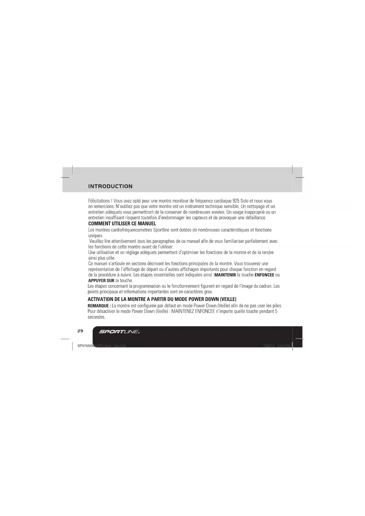 Les montres cardiofréquencemètres Sportline sont dotées de nombreuses caractéristiques et fonctions uniques. Veuillez lire attentivement tous les paragraphes de ce manuel afin de vous familiariser parfaitement avec les fonctions de cette montre avant de l’utiliser. Une utilisation et un réglage adéquats permettent d’optimiser les fonctions de la montre et de la rendre ainsi plus utile. Ce manuel s’articule en sections décrivant les fonctions principales de la montre. Vous trouverez une représentation de l’affichage de départ ou d’autres affichages importants pour chaque fonction en regard de la procédure à suivre. Les étapes essentielles sont indiquées ainsi : MAINTENIR la touche ENFONCEE ou APPUYER SUR la touche. Les étapes concernant la programmation ou le fonctionnement figurent en regard de l’image du cadran. Les points principaux et informations importantes sont en caractères gras. ACTIVATION DE LA MONTRE A PARTIR DU MODE POWER DOWN (VEILLE) REMARQUE : La montre est configurée par défaut en mode Power Down (Veille) afin de ne pas user les piles. Pour désactiver le mode Power Down (Veille) : MAINTENEZ ENFONCEE n’importe quelle touche pendant 5 secondes. SP5705IS03SPO.indd Sec1:29SP5705IS03SPO.indd Sec1:29 7/28/10 4:34 PM7/28/10 4:34 PM30 925 Solo