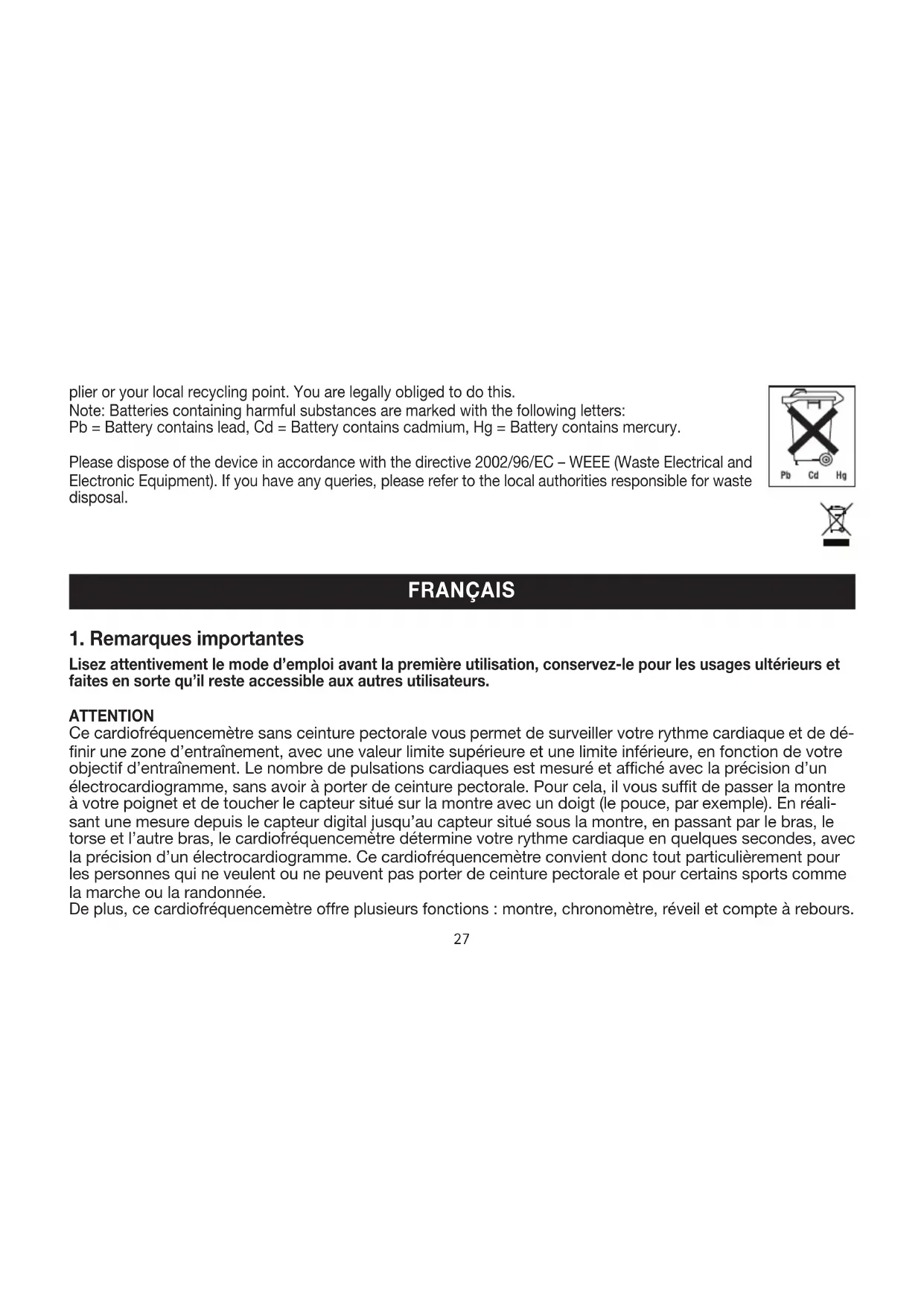 Ce cardiofréquencemètre est conçu pour une utilisation personnelle et ne doit pas être utilisé à des fins mé- dicales. – Il ne doit pas être exposé à des températures extrêmes, à des vibrations ou à des chocs.