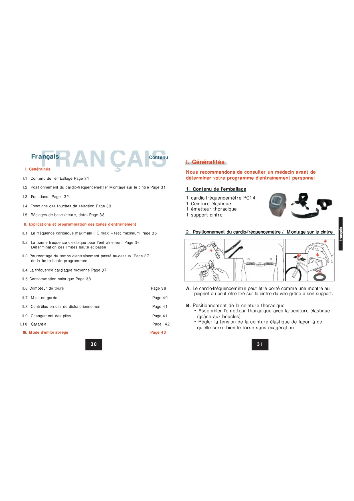 I.1 Contenu de l’emballage Page 31 I.2 Positionnement du cardio-fréquencemètre/Montage sur le cintre Page 31 I.3 Fonctions Page 32 I.4 Fonctions des touches de sélection Page 33 I.5 Réglages de base (heure, date) Page 33