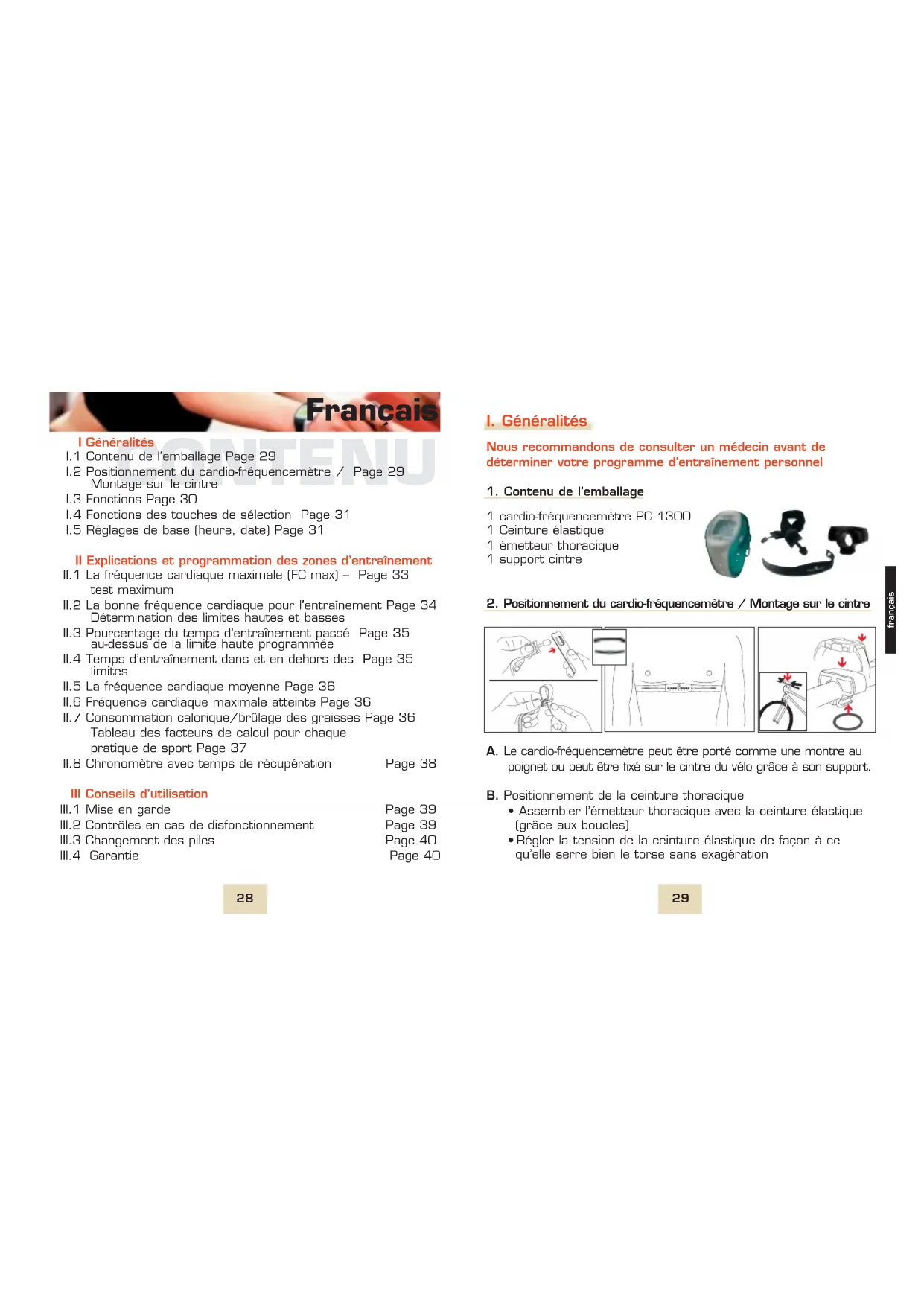 CONTENU I Généralités I.1 Contenu de l’emballage Page 29 I.2 Positionnement du cardio-fréquencemètre / Page 29 Montage sur le cintre I.3 Fonctions Page 30 I.4 Fonctions des touches de sélection Page 31 I.5 Réglages de base (heure, date) Page 31 II Explications et programmation des zones d’entraînement II.1 La fréquence cardiaque maximale (FC max) – Page 33 test maximum II.2 La bonne fréquence cardiaque pour l’entraînement Page 34 Détermination des limites hautes et basses II.3 Pourcentage du temps d’entraînement passé Page 35 au-dessus de la limite haute programmée II.4 Temps d’entraînement dans et en dehors des Page 35 limites II.5 La fréquence cardiaque moyenne Page 36 II.6 Fréquence cardiaque maximale atteinte Page 36 II.7 Consommation calorique/brûlage des graisses Page 36 Tableau des facteurs de calcul pour chaque pratique de sport Page 37 II.8 Chronomètre avec temps de récupération Page 38 III Conseils d'utilisation III.1 Mise en garde Page 39 III.2 Contrôles en cas de disfonctionnement Page 39 III.3 Changement des piles Page 40 III.4 Garantie Page 40 Français