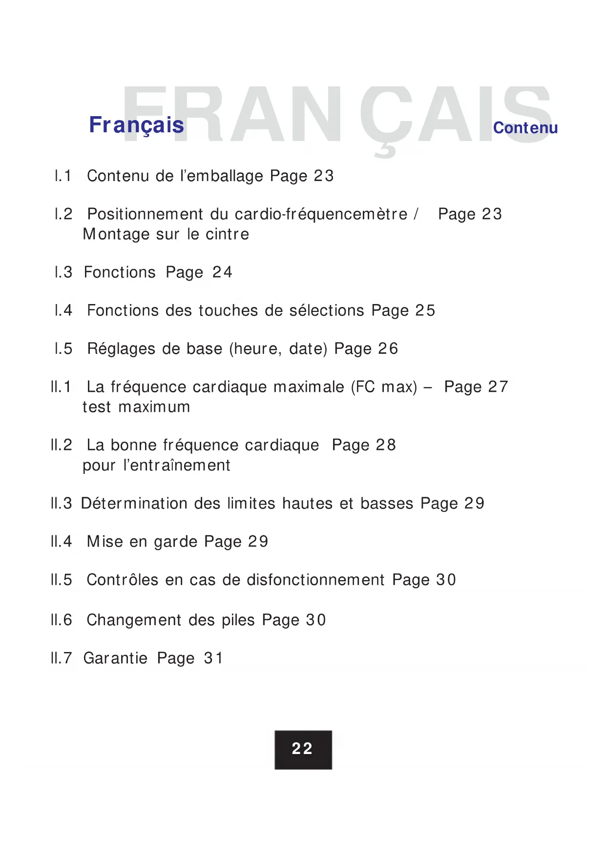 I.1 Contenu de l’emballage Page 23 I.2 Positionnement du cardio-fréquencemètre / Page 23 Montage sur le cintre I.3 Fonctions Page 24 I.4 Fonctions des touches de sélections Page 25 I.5 Réglages de base (heure, date) Page 26 II.1 La fréquence cardiaque maximale (FC max) – Page 27 test maximum II.2 La bonne fréquence cardiaque Page 28 pour l’entraînement II.3 Détermination des limites hautes et basses Page 29 II.4 Mise en garde Page 29 II.5 Contrôles en cas de disfonctionnement Page 30 II.6 Changement des piles Page 30 II.7 Garantie Page 3123