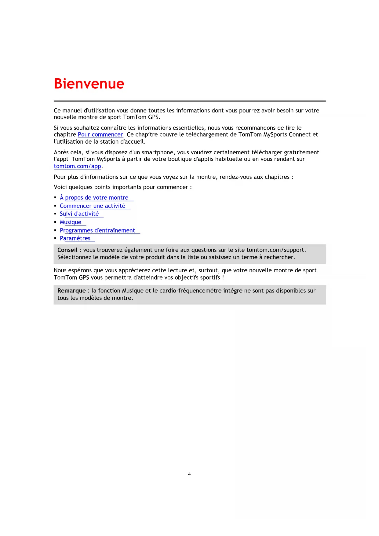 Ce manuel d'utilisation vous donne toutes les informations dont vous pourrez avoir besoin sur votre nouvelle montre de sport TomTom GPS. Si vous souhaitez connaître les informations essentielles, nous vous recommandons de lire le chapitre Pour commencer. Ce chapitre couvre le téléchargement de TomTom MySports Connect et l'utilisation de la station d'accueil. Après cela, si vous disposez d'un smartphone, vous voudrez certainement télécharger gratuitement l'appli TomTom MySports à partir de votre boutique d'applis habituelle ou en vous rendant sur tomtom.com/app. Pour plus d'informations sur ce que vous voyez sur la montre, rendez-vous aux chapitres : Voici quelques points importants pour commencer : À propos de votre montre Commencer une activité Suivi d'activité Musique Programmes d'entraînement Paramètres Conseil : vous trouverez également une foire aux questions sur le site tomtom.com/support. Sélectionnez le modèle de votre produit dans la liste ou saisissez un terme à rechercher. Nous espérons que vous apprécierez cette lecture et, surtout, que votre nouvelle montre de sport TomTom GPS vous permettra d'atteindre vos objectifs sportifs ! Remarque : la fonction Musique et le cardio-fréquencemètre intégré ne sont pas disponibles sur tous les modèles de montre. Bienvenue5