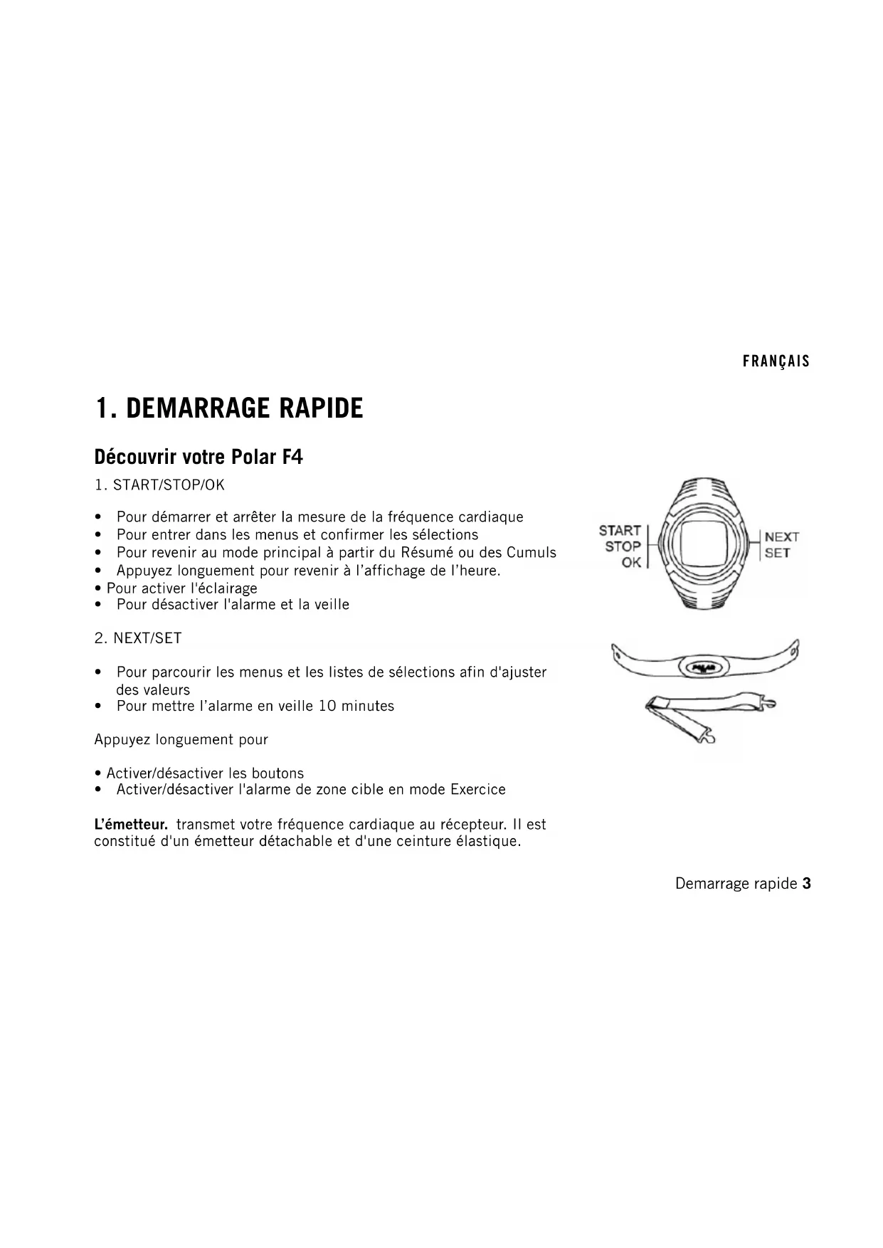 - Activer/désactiver l'alarme de zone cible en mode Exercice L’émetteur. transmet votre fréquence cardiaque au récepteur. Il est constitué d'un émetteur détachable et d'une ceinture élastique. FRANÇAIS Demarrage rapide 3Entrer les réglages de base