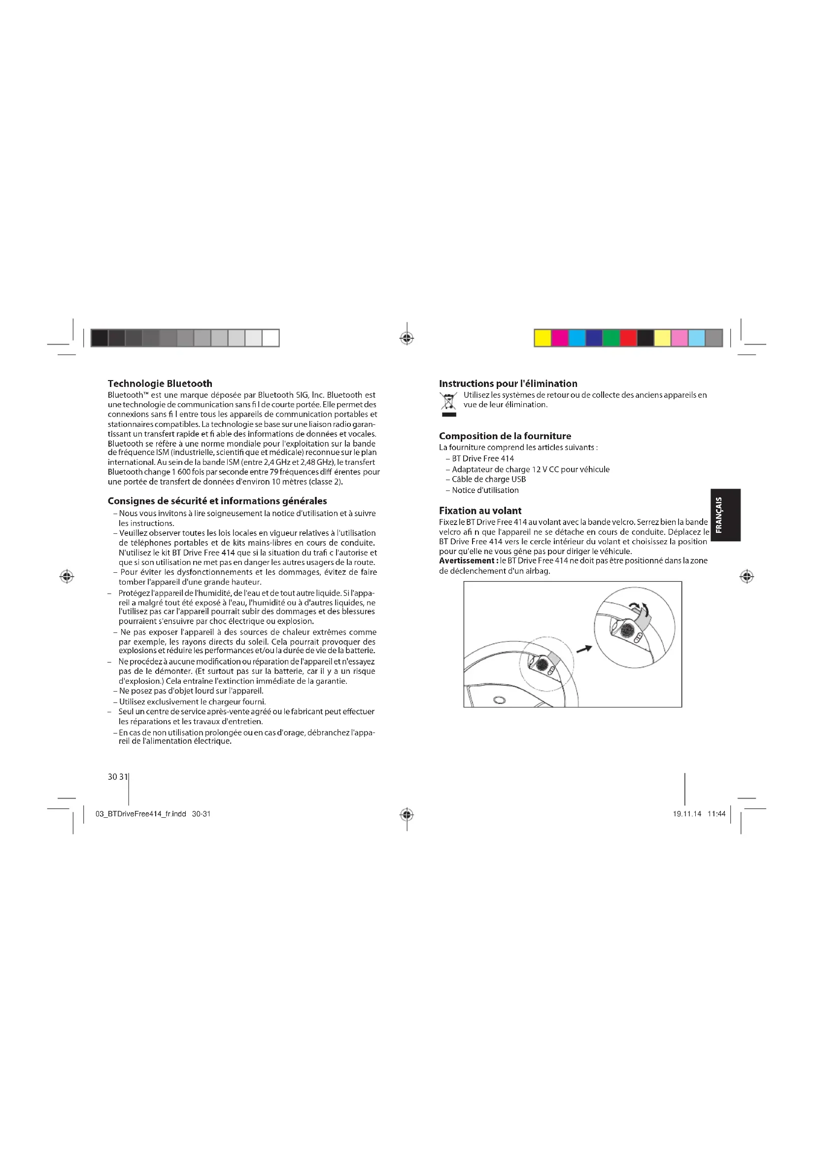 de déclenchement d'un airbag. 03_BTDriveFree414_fr.indd 30-3103_BTDriveFree414_fr.indd 30-31 19.11.14 11:4419.11.14 11:4432 33 FRANÇAIS Vue d'ensemble Touche MF (touche multi-fonctions lumineuse) Haut-parleur Réduire le volume sonore (–) Augmenter le volume sonore (+) Microphone Douille de charge (raccordement micro USB) Bande velcro pour la xation au volant Informations sur la batterie L'appareil est équipé d'une batterie lithium-polymère intégrée. La batterie ne peut pas être remplacée. N'essayez pas de sortir la batterie de l'appareil car cela endommage l'appareil. La pleine puissance d'une batterie neuve n'est atteinte qu'au bout de deux ou trois cycles de charge/décharge complets. La batterie peut être rechargée et déchargée plusieurs centaines de fois mais sa capacité se dégrade avec le temps. Débrancher le BT Drive Free 414 de l'alimentation électrique dès que la bat- terie est entièrement chargée, car une surcharge réduit la durée de vie de la batterie. Une batterie chargée perd de sa capacité en cas de non utilisation. Important: veiller à ce que la batterie soit entièrement chargée en cas de non utilisation prolongée de l'appareil. A n d'éviter une décharge profonde de la batterie, il faut recharger le BT Drive Free 414 au moins tous les 2 mois. Recharge de la batterie Le BT Drive Free 414 fonctionne grâce à une batterie rechargeable. Charger totalement la batterie avant la première utilisation. Lisez le paragraphe «Informations sur la batterie» avant de commencer l'opération de charge. Pour le recharger, vous devez retirer le BT Drive Free 414 du volant. La douille de charge se trouve sur le côté de l'appareil qui repose contre le volant. Reliez le BT Drive Free 414 à l'adaptateur de charge automobile à l'aide du câble USB. Branchez l'adaptateur de charge automobile dans l'allume-cigares du véhicule. Le BT Drive Free 414 peut aussi se recharger sur un ordinateur avec le câble USB. Remarque: dès que l'appareil est branché, le BT Drive Free 414 s'éteint. Pendant l'opération de charge, la touche MF s'allume en rouge. Lorsque la batterie est totalement chargée, la touche MF s'allume en bleu. L'opération de charge de la batterie dure env. 3 heures. Une fois que la batterie est chargée, débranchez le BT Drive Free 414. Une batterie complètement chargée permet un temps de communication de jusqu'à 7 heures et une autonomie en veille de jusqu'à 300 heures. Lorsque l'état de charge de la batterie s'a aiblit, la touche MF clignote en rouge toutes les 3 secondes et des bips sonores retentissent toutes les 60 secondes. Mise en marche et arrêt Mise en marche Pour la mise en marche, maintenez la touche MF enfoncée pendant 3 secondes jusqu'à ce que vous entendiez un bip sonore aigu et que la touche MF s'allume en bleu. Ensuite, la touche MF clignote en bleu et l'appareil est allumé. Arrêt Pour éteindre l'appareil, maintenez la touche MF enfoncée pendant 3 secondes jusqu'à ce que vous entendiez un bip sonore grave et que la touche MF s'allume en rouge. L'appareil est ensuite arrêté. 03_BTDriveFree414_fr.indd 32-3303_BTDriveFree414_fr.indd 32-33 19.11.14 11:4419.11.14 11:4434 35 FRANÇAIS Couplage (Pairage) et connexion avec le téléphone portable Avant de pouvoir utiliser le BT Drive Free 414, vous devez le coupler et le relier avec un téléphone portable compatible Bluetooth. Le couplage s'e ectue une bonne fois pour toute et ne s'avère nécessaire que lors de la première liaison avec le téléphone portable. Le BT Drive Free 414 peut être couplé avec jusqu'à huit téléphones portables et être relié simultanément avec deux téléphones portables. Appariement intelligent du NFC La procédure d'appariement intelligent du NFC est disponible pour BT Drive Free 414 a n de rendre l'appariement beaucoup plus simple et plus rapide. Assurez-vous que le système d'exploitation de votre téléphone portable est Android 4.1, Windows 8, Blackberry 7.0 ou une version ultérieure. Le capteur du NFC est en général situé au dos du téléphone. – Veuillez en premier lieu activer la fonction NFC dans le menu Paramètres de votre téléphone. – Déverrouillez l'écran de votre téléphone pour activer la détection NFC, puis touchez la zone du capteur du NFC de BT Drive Free 414 située sur le côté de votre téléphone portable. Le téléphone portable émettra un signal sonore s'il détecte que le haut-parleur est coupé, et le BT Drive Free 414 s'activera et accèdera automatiquement au mode appariement. Capteur du NFC – Con rmez la requête d'appariement qui s'a che sur l'écran du téléphone, et l'appariement s'exécutera. Dans le cas contraire, veuillez suivre les étapes générales pour exécuter la procédure d'appariement. Procédure générale – Maintenez le BT Drive Free 414 à portée d'un téléphone portable compa- tible Bluetooth; la distance doit être au maximum d'un mètre. – Le BT Drive Free 414 doit être arrêté. – Appuyez sur la touche MF pendant env. 6 secondes jusqu'à ce que vous entendiez un bip sonore grave et que la touche MF clignote en alternance en rouge et en bleu. L'appareil se trouve en mode couplage. – Activez la fonction Bluetooth du téléphone portable et lancez la recherche d'appareils Bluetooth. (Pour ce faire, consultez la notice d'utilisation du téléphone portable). – Sur la liste des appareils détectés, sélectionnez «BT DF 414». – Tapez éventuellement le code PIN «0000» et confirmez la saisie. Si l'opé- ration de couplage s'est effectuée correctement, vous entendez un bip sonore et la touche MF s'allume pendant 3 secondes en bleu. (Remarque: le code PIN est préprogrammé et ne peut pas être modifié.) – Après le couplage, le BT Drive 414 se connecte automatiquement avec le téléphone portable. Sur certains téléphones portables, vous devez con rmer la liaison manuellement. Ensuite, le BT Drive Free 414 passe en mode veille et la touche MF clignote