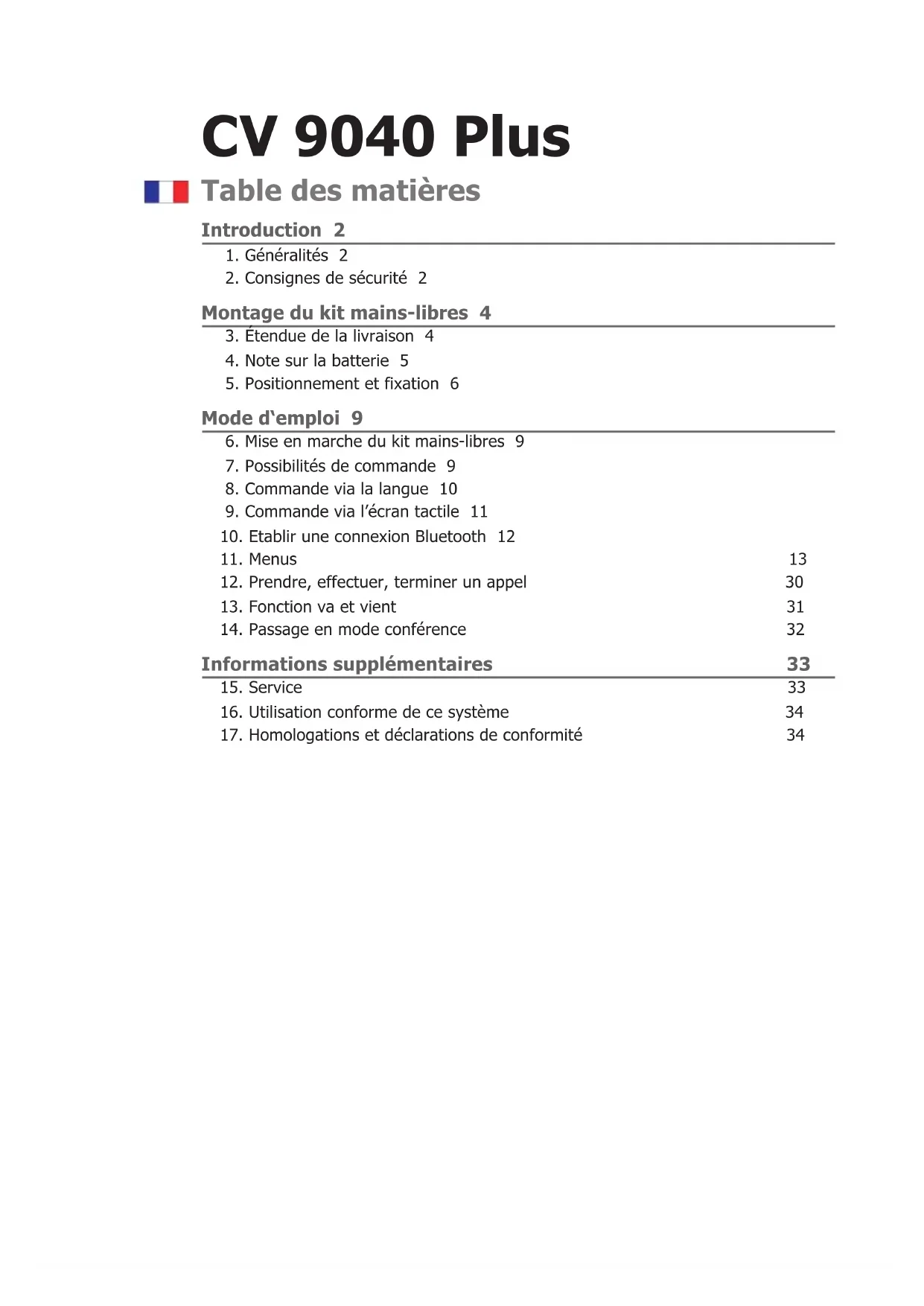 Tout non-respect de ces limites risquerait d'endommager la batterie et ainsi provoquer la panne complète du kit mains-libres.