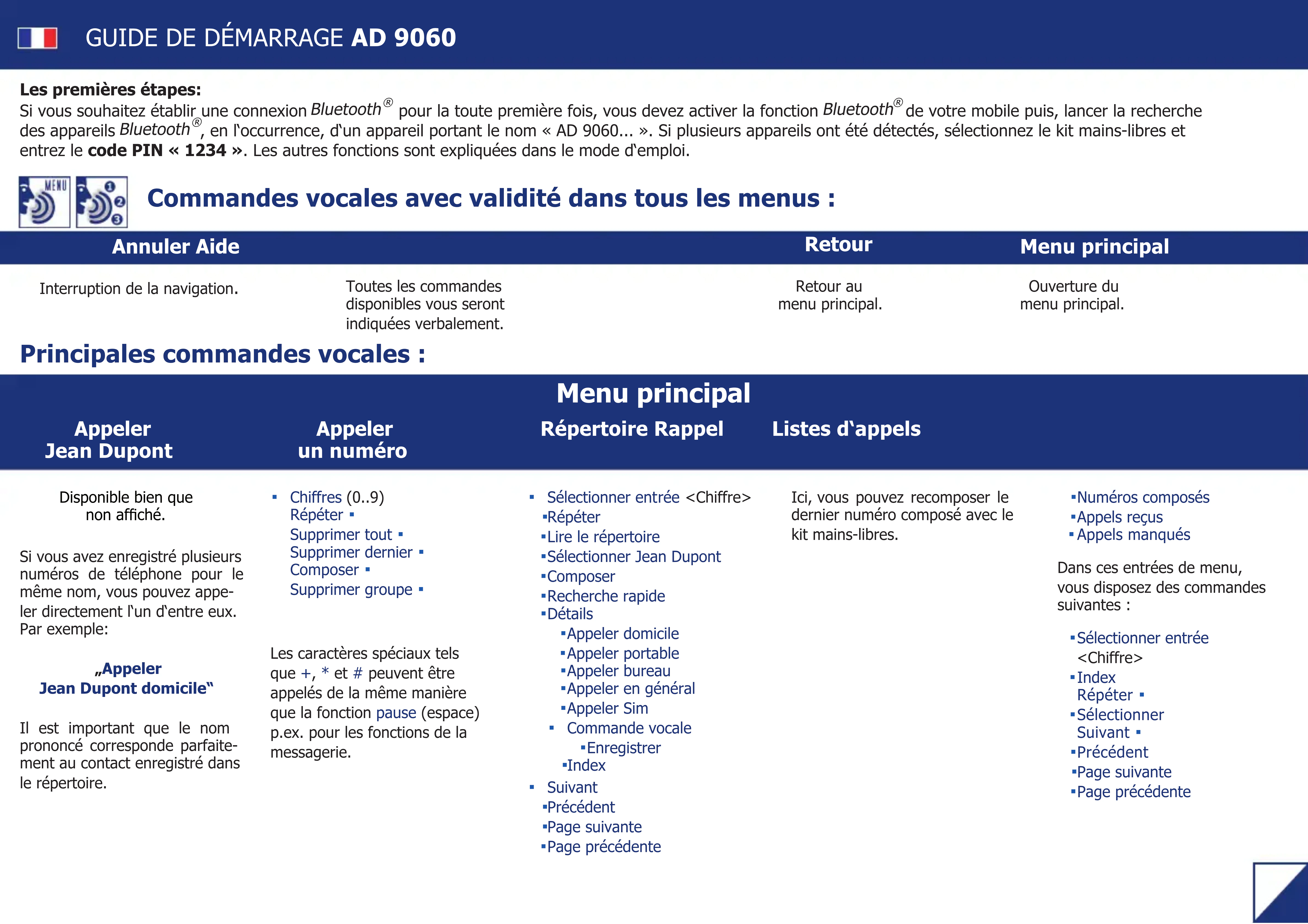 Si vous souhaitez établir une connexion Bluetooth ^ pour la toute première fois, vous devez activer la fonction Bluetooth ^ de votre mobile puis, lancer la recherche des appareils Bluetooth ^ , en l'occurrence, d'un appareil portant le nom « AD 9060... ». Si plusieurs appareils ont été détectés, sélectionnez le kit mains-libres et entrez le code PIN « 1234 ». Les autres fonctions sont expliquées dans le mode d'emploi.