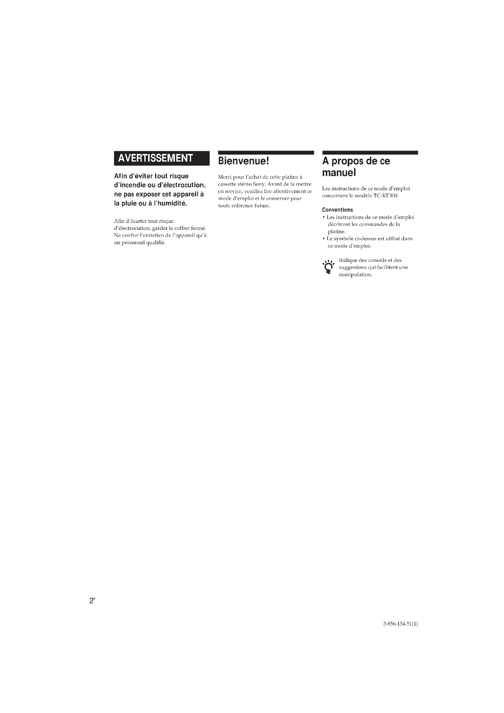 - Les instructions de ce mode d’emploidécrivent les commandes de laplatine.• Le symbole ci-dessus est utilisé dansce mode d’emploi: Indique des conseils et dessuggestions qui facilitent unemanipulation. AVERTISSEMENT Afin d’éviter tout risque d’incendie ou d’électrocution, ne pas exposer cet appareil à la pluie ou à l’humidité. Afin d’écarter tout risqued’électrocution, garder le coffret fermé.Ne confier l’entretien de l’appareil qu’àun personnel qualifié.GBGB 3-856-134-51(1)