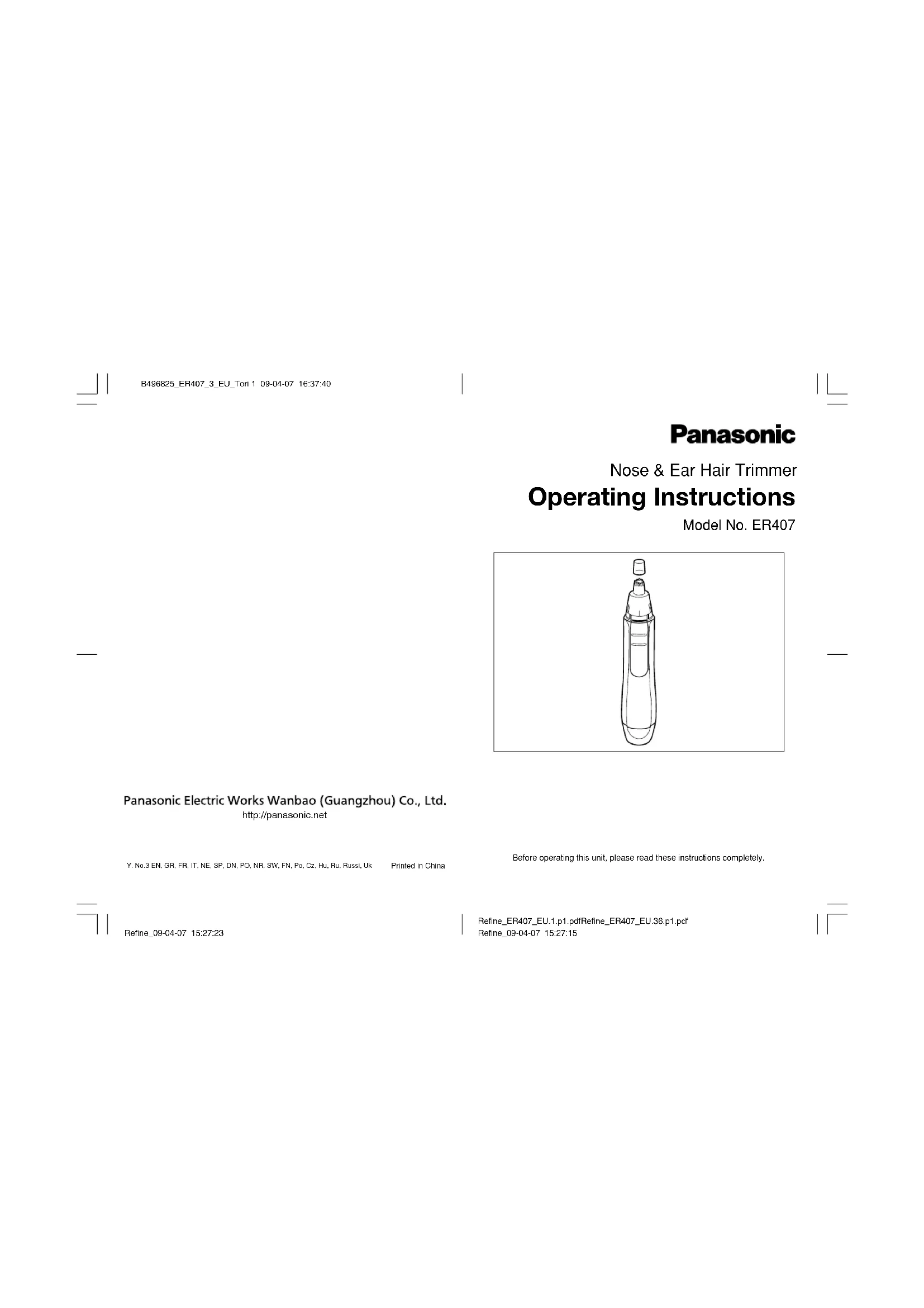 Retrouvez gratuitement la notice de l'appareil ER407K PANASONIC au format PDF.