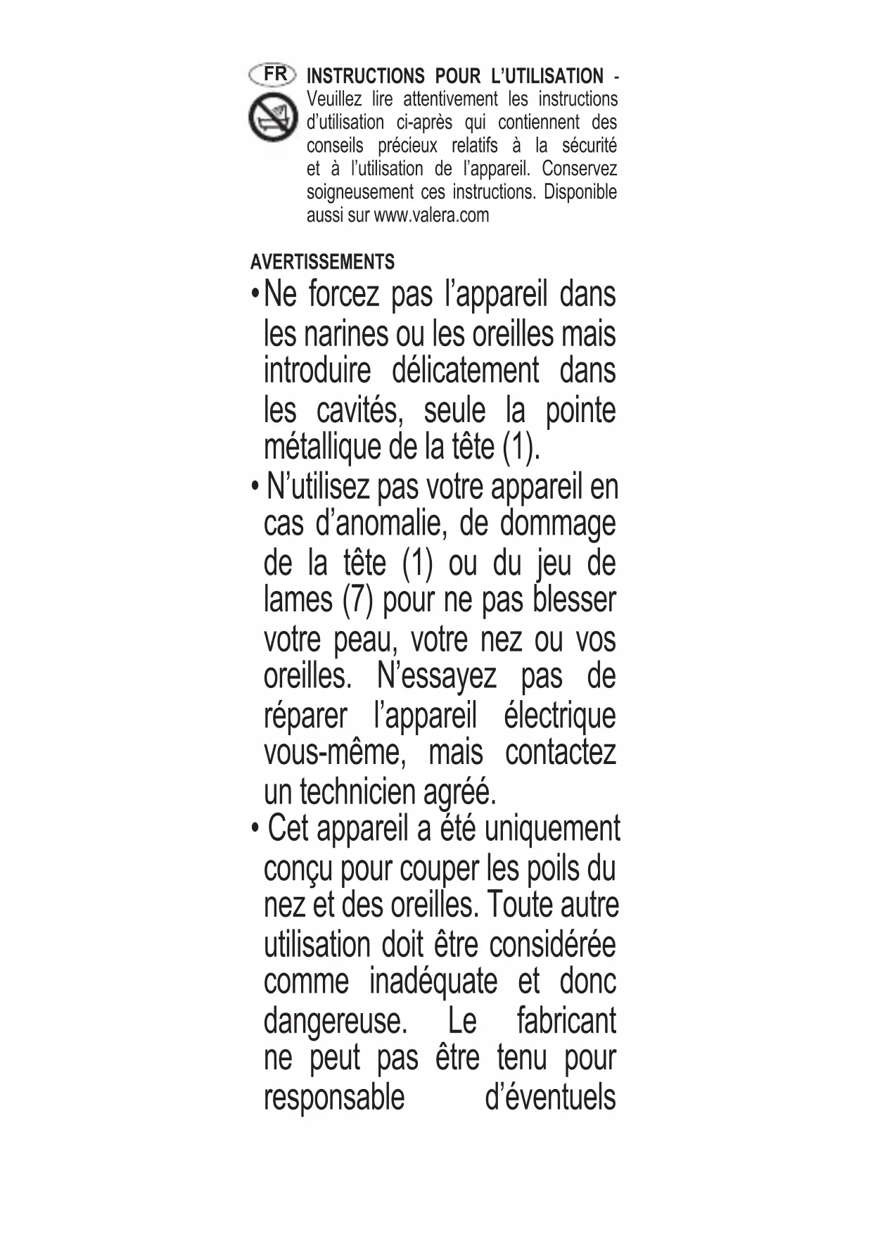 - Cet appareil a été uniquement conçu pour couper les poils du nez et des oreilles. Toute autre utilisation doit être considérée comme inadéquate et donc dangereuse. Le fabricant ne peut pas être tenu pour responsable d’éventuels