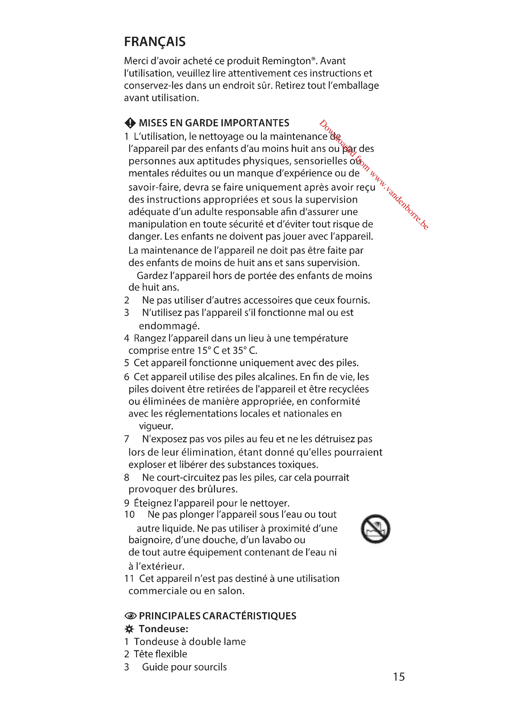 Downloaded from www.vandenborre.beMerci d’avoir acheté ce produit Remington®. Avant l’utilisation, veuillez lire attentivement ces instructions et conservez-les dans un endroit sûr. Retirez tout l’emballage avant utilisation.