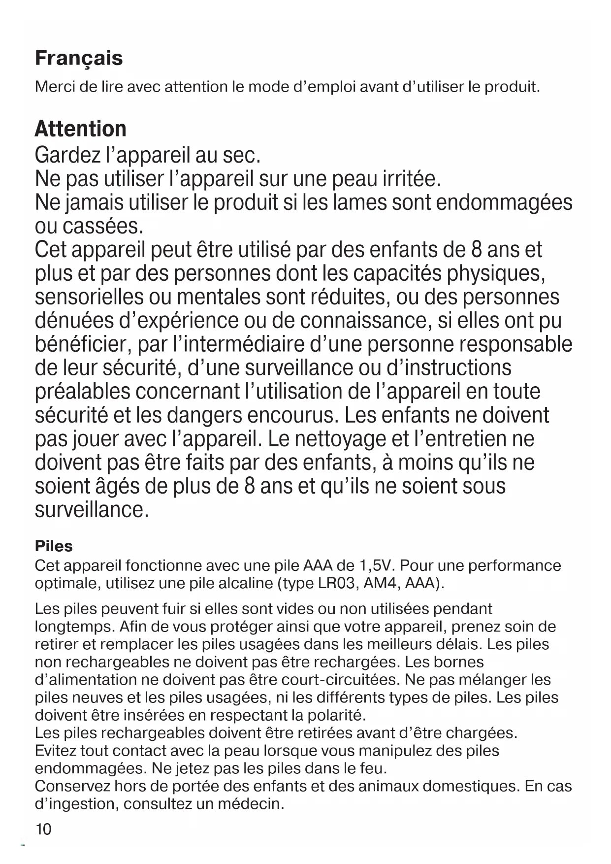 - long trimming comb (7): 8 mm / 1/3 Ensure that the appliance is turned off before attaching a trimming comb. We recommend that you start with the long trimming comb. Slide it over the cutting head (2) until it clicks into place. Turn on the appliance and gently comb your eyebrow against the direction of hair growth as shown in (b). Ensure that either one of the comb sides is guided flat against the skin. Cleaning and maintenance Always turn off the appliance before cleaning. Remove the cutting head (2) by turning counterclockwise 90° and then lifting it up (c). You can rinse the detached cutting head under warm running water. Please ensure that the cutting head is complete dry before attaching it. For storage, the stand (5) can be used. Attach the protective cap (1) to the cutting head (2). We recommend lubricating the blade with a drop of light machine oil twice a year or after cleaning with water. Subject to change without notice Product contains batteries and/or recyclable electric waste. For environment protection do not dispose of in household waste, but for recycling take to electric waste collection points provided in your country. 91221272_PT_5010_EURO_S4-86.indd 891221272_PT_5010_EURO_S4-86.indd 8 02.11.16 11:4602.11.16 11:46 CSS APPROVED Effective Date 4Nov2016 GMT - Printed 04Jan2017 Page 8 of 869 Guarantee We grant a 2 year guarantee on the product commencing on the date of purchase. Within the guarantee period we will eliminate any defects in the appliance resulting from faults in materials or workmanship, free of charge either by repairing or replacing the complete appliance at our discretion. This guarantee extends to every country where this appliance is supplied by Braun or its appointed distributor. This guarantee does not cover: damage due to improper use, normal wear or use as well as defects that have a negligible effect on the value or operation of the appliance. The guarantee becomes void if repairs are undertaken by unauthorised persons and if original Braun parts are not used. To obtain service within the guarantee period, hand in or send the complete appliance with your sales receipt to an authorised Braun Customer Service Centre (address information available online at www.service.braun.com). For UK only: This guarantee in no way affects your rights under statutory law. 91221272_PT_5010_EURO_S4-86.indd 991221272_PT_5010_EURO_S4-86.indd 9 02.11.16 11:4602.11.16 11:46 CSS APPROVED Effective Date 4Nov2016 GMT - Printed 04Jan2017 Page 9 of 8610 Merci de lire avec attention le mode d’emploi avant d’utiliser le produit. Attention Gardez l’appareil au sec. Ne pas utiliser l’appareil sur une peau irritée. Ne jamais utiliser le produit si les lames sont endommagées ou cassées. Cet appareil peut être utilisé par des enfants de 8 ans et plus et par des personnes dont les capacités physiques, sensorielles ou mentales sont réduites, ou des personnes dénuées d’expérience ou de connaissance, si elles ont pu bénéficier, par l’intermédiaire d’une personne responsable de leur sécurité, d’une surveillance ou d’instructions préalables concernant l’utilisation de l’appareil en toute sécurité et les dangers encourus. Les enfants ne doivent pas jouer avec l’appareil. Le nettoyage et l’entretien ne doivent pas être faits par des enfants, à moins qu’ils ne soient âgés de plus de 8 ans et qu’ils ne soient sous surveillance. Piles Cet appareil fonctionne avec une pile AAA de 1,5V. Pour une performance optimale, utilisez une pile alcaline (type LR03, AM4, AAA). Les piles peuvent fuir si elles sont vides ou non utilisées pendant longtemps. Afin de vous protéger ainsi que votre appareil, prenez soin de retirer et remplacer les piles usagées dans les meilleurs délais. Les piles non rechargeables ne doivent pas être rechargées. Les bornes d’alimentation ne doivent pas être court-circuitées. Ne pas mélanger les piles neuves et les piles usagées, ni les différents types de piles. Les piles doivent être insérées en respectant la polarité. Les piles rechargeables doivent être retirées avant d’être chargées. Evitez tout contact avec la peau lorsque vous manipulez des piles endommagées. Ne jetez pas les piles dans le feu. Conservez hors de portée des enfants et des animaux domestiques. En cas d’ingestion, consultez un médecin. Français 91221272_PT_5010_EURO_S4-86.indd 1091221272_PT_5010_EURO_S4-86.indd 10 02.11.16 11:4602.11.16 11:46 CSS APPROVED Effective Date 4Nov2016 GMT - Printed 04Jan2017 Page 10 of 8611 Remplacement des piles Assurez vous que l’appareil est éteint. Retirez le capot du compartiment à piles (4) en tirant vers le bas (a). Insérez les piles avec les polarités (+) et (–) dans le sens indiqué. Refermez le compartiment à piles. Utilisation du produit Cet appareil est parfait pour couper avec précision et en toute sécurité tous les poils indésirables sur le corps et le visage (ex : cou, menton, sourcils). Tournez le bouton marche/arrêt (3) pour mettre en marche l’appareil. Placez la tête (2) sur la partie de la peau à raser et guidez le doucement à contre sens du poil. Pour un résultat optimum, tendez la peau avec une main durant l’utilisation. Le produit est fourni avec deux sabots de tonte de différentes longueurs pour couper le poil à une hauteur uniforme (ex : le sourcil) :