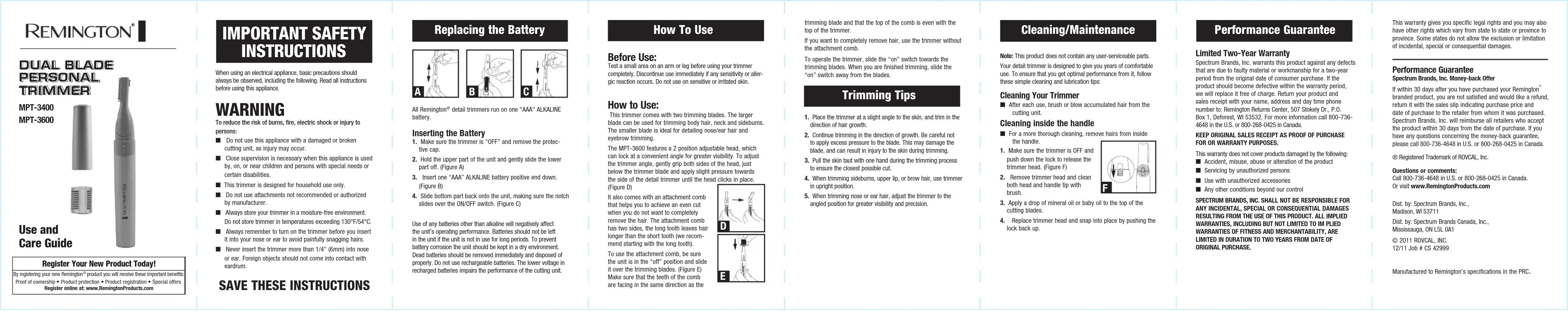 Cleaning/Maintenance 1. Place the trimmer at a slight angle to the skin, and trim in the direction of hair growth.2. Continue trimming in the direction of growth. Be careful not to apply excess pressure to the blade. This may damage the blade, and can result in injury to the skin during trimming.3. Pull the skin taut with one hand during the trimming process to ensure the closest possible cut.4. When trimming sideburns, upper lip, or brow hair, use trimmer in upright position.5. When trimming nose or ear hair, adjust the trimmer to the angled position for greater visibility and precision. Trimming Tips DUAL BLADE PERSONAL TRIMMER trimming blade and that the top of the comb is even with the top of the trimmer.If you want to completely remove hair, use the trimmer without the attachment comb.To operate the trimmer, slide the “on” switch towards the trimming blades. When you are finished trimming, slide the “on” switch away from the blades. DGarantie de rendement Garantie limitée de deux ansSpectrum Brands, Inc. garantit ce produit contre toute défectuosité due à des vices matériels et de fabrication pour une période de deux ans à compter de la date d’achat. Si ce produit devait faire défaut au cours de la période de garantie, nous le remplacerons sans frais. Retournez votre produit accompagné du reçu de caisse avec vos nom, adresse et numéro de téléphone de jour à : Remington Returns Center, 507 Stokely Dr., P.O. Box 1, Deforest, WI 53532. Pour obtenir de plus amples renseignements, compo-sez le 800-736-4648 aux É.-U. ou le 800-268-0425au Canada.CONSERVEZ LE REÇU DE CAISSE ORIGINAL COMME PREUVE D’ACHAT AUX FINS DE LA GARANTIE.Cette garantie ne couvre pas les produits endommagés par ce qui suit :■ Accident, mésusage, usage abusif ou modification du produit■ Réparation par des personnes non autorisées■ Utilisation avec des accessoires non autorisés■ Toute autre circonstance indépendante de notre volontéSPECTRUM BRANDS, INC. DÉCLINE TOUTE RESPONSABILITÉ POUR LES DOMMAGES INDIRECTS, PARTICULIERS OU CONSÉCUTIFS RÉSULTANT DE L’UTILISATION DE CE PRODUIT. TOUTES LES GARANTIES IMPLICITES, Y COMPRIS SANS TOUTEFOIS S’Y LIMITER LES GARANTIES DE QUALITÉ MARCHANDE ET D’ADÉQUATION À UN USAGE PARTICULIER, SONT LIMITÉES À UNE PÉRIODE DE DEUX ANS À COMPTER DE LA DATE D’ACHAT INITIALE.La présente garantie vous confère des droits spécifiques, cependant vous pouvez avoir d’autres droits qui varient d’un État ou d’une province à l’autre. Par exemple, certains États n’autorisent pas l’exclusion ni la limite des dommages indi-rects, particuliers et consécutifs.Garantie de rendementGarantie de remboursement de Spectrum Brands, Inc.Si vous n’êtes pas satisfait et désirez obtenir un rembourse-ment au cours des 30 jours qui suivent l’achat de ce produit de marque Remington , retournez le produit avec son reçu de caisse indiquant le prix et la date d’achat au détaillant où vous l’avez acheté. Spectrum Brands, Inc. remboursera tous les détaillants qui acceptent le produit dans les 30 jours suivant la date d’achat. Si vous avez des questions concernant la présente garantie de remboursement, veuillez composer le 800-736-4648 aux É.-U. ou le 800-268-0425 au Canada ® Marque déposée de ROVCAL, Inc.Questions ou commentaires : Composez le 800-736-4648 aux É.-U. ou le 800-268-0425 au Canada, ou visitez www.RemingtonProducts.com.Dist. par : Spectrum Brands, Inc., Madison, WI 53711Dist. par : Spectrum Brands Canada, Inc., Mississauga, ON L5L 0A1© 2011 ROVCAL, INC. 12/11 Travail n° CS 42999Fabriqué selon les spécifications de Remington en RPC T22-337911. Tenez la tondeuse à angle presque droit par rapport à la peau, et coupez dans le sens de la pousse des poils.2. Continuez de couper dans le sens de la pousse. Évitez de trop peser sur la lame. Ceci risquerait de l’abîmer et vous pourriez vous blesser.3. Tirez fermement sur la peau avec une main pendant que vous coupez avec l’autre pour que les poils soient coupés le plus ras possible.4. Pour tailler les favoris, les poils sur la lèvre supérieure ou les sourcils, utilisez la tondeuse en position droite.5. Pour couper les poils du nez ou des oreilles, inclinez la tête de la tondeuse pour mieux voir et tailler avec précision.