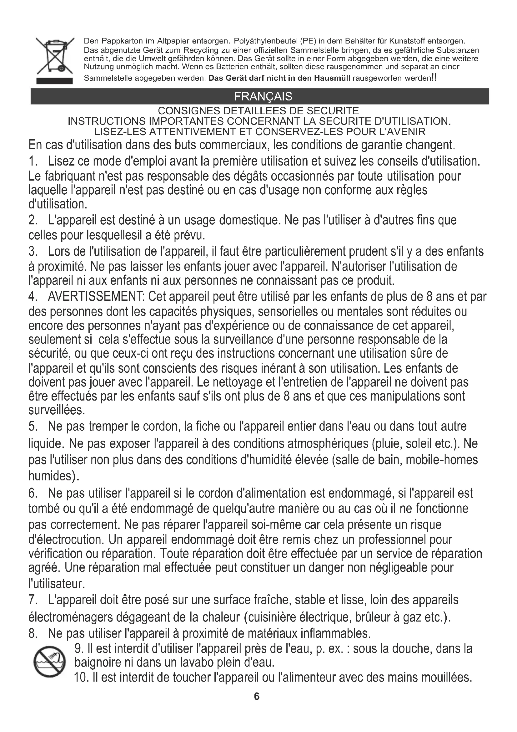 9. Il est interdit d'utiliser l'appareil près de l'eau, p. ex. : sous la douche, dans la