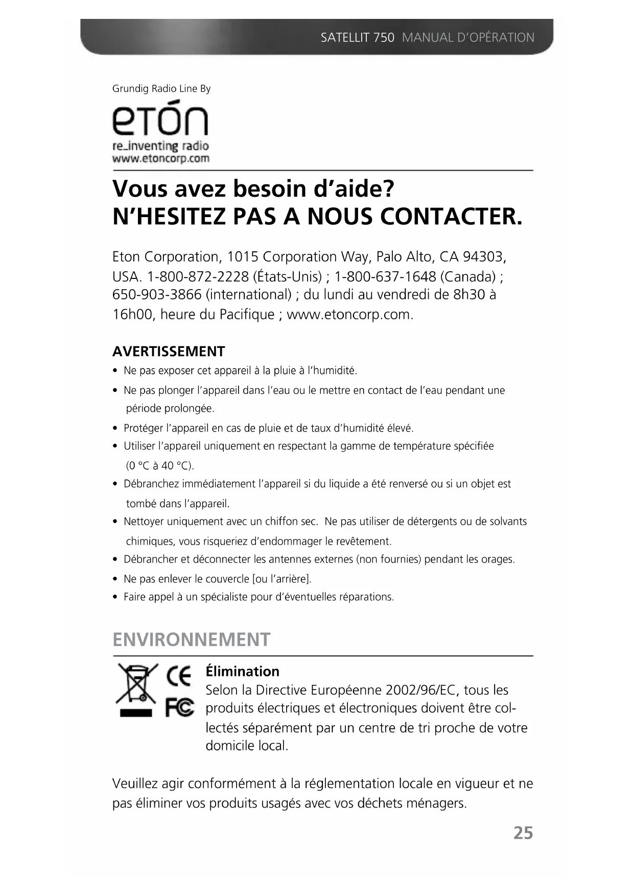 Vous avez besoin d’aide? N’HESITEZ PAS A NOUS CONTACTER. Eton Corporation, 1015 Corporation Way, Palo Alto, CA 94303, USA. 1-800-872-2228 (États-Unis) ; 1-800-637-1648 (Canada) ; 650-903-3866 (international) ; du lundi au vendredi de 8h30 à 16h00, heure du Pacique ; www.etoncorp.com. AVERTISSEMENT