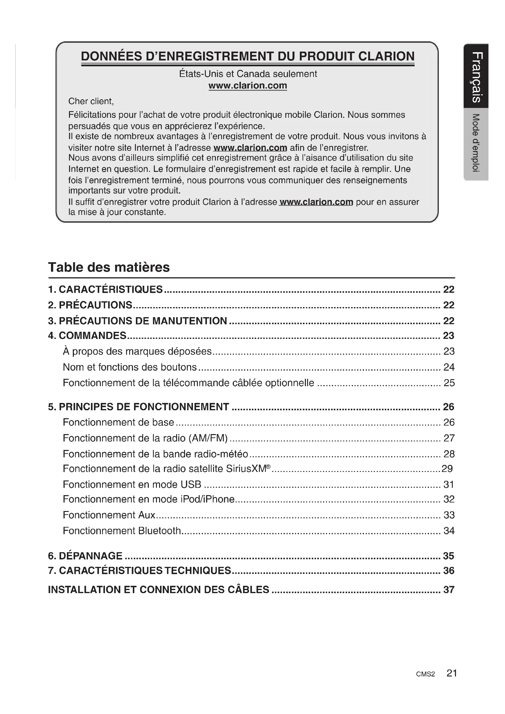 - DONNÉES D’ENREGISTREMENT DU PRODUIT CLARION États-Unis et Canada seulement www.clarion.com Cher client, Félicitations pour l’achat de votre produit électronique mobile Clarion. Nous sommes persuadés que vous en apprécierez l’expérience. Il existe de nombreux avantages à l’enregistrement de votre produit. Nous vous invitons à visiter notre site Internet à l’adresse www.clarion.com afin de l’enregistrer. Nous avons d’ailleurs simplifié cet enregistrement grâce à l’aisance d’utilisation du site Internet en question. Le formulaire d’enregistrement est rapide et facile à remplir. Une fois l’enregistrement terminé, nous pourrons vous communiquer des renseignements importants sur votre produit. Il suffit d’enregistrer votre produit Clarion à l’adresse www.clarion.com pour en assurer la mise à jour constante. Table des matières 1. CARACTÉRISTIQUES p. 22