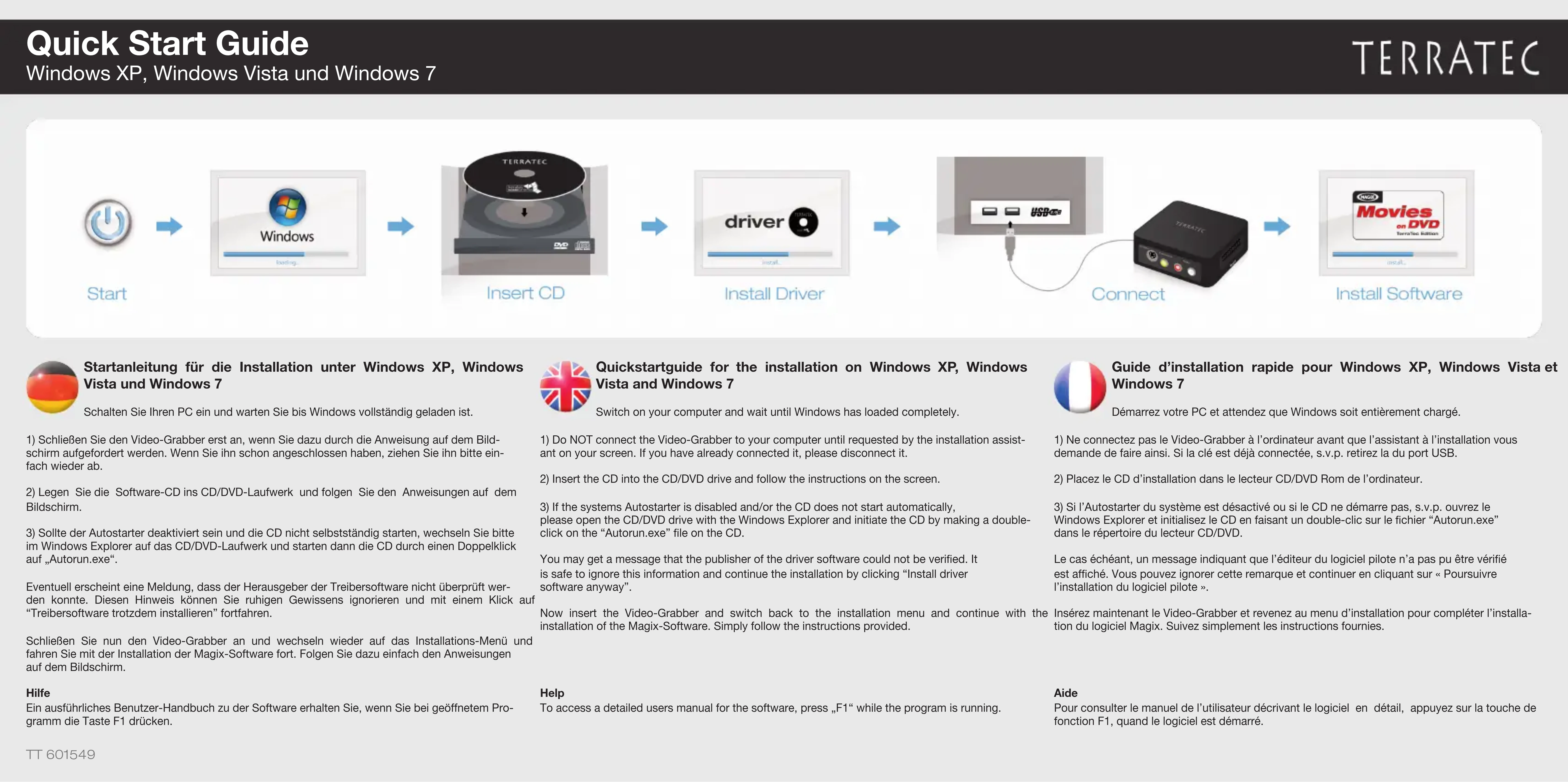 Windows Explorer et initialisez le CD en faisant un double-clic sur le chier “Autorun.exe” dans le répertoire du lecteur CD/DVD. Le cas échéant, un message indiquant que l’éditeur du logiciel pilote n’a pas pu être vérié est afché. Vous pouvez ignorer cette remarque et continuer en cliquant sur « Poursuivre l’installation du logiciel pilote ». Insérez maintenant le Video-Grabber et revenez au menu d’installation pour compléter l’installa- tion du logiciel Magix. Suivez simplement les instructions fournies. Aide Pour consulter le manuel de l’utilisateur décrivant le logiciel en détail, appuyez sur la touche de fonction F1, quand le logiciel est démarré. TT 601549Quick Start Guide Windows XP, Windows Vista und Windows 7 Quickstartguide per l‘installazione in Windows XP, Windows Vista e Windows 7 Accendete il PC e attendere no al completo caricamento di Windows .