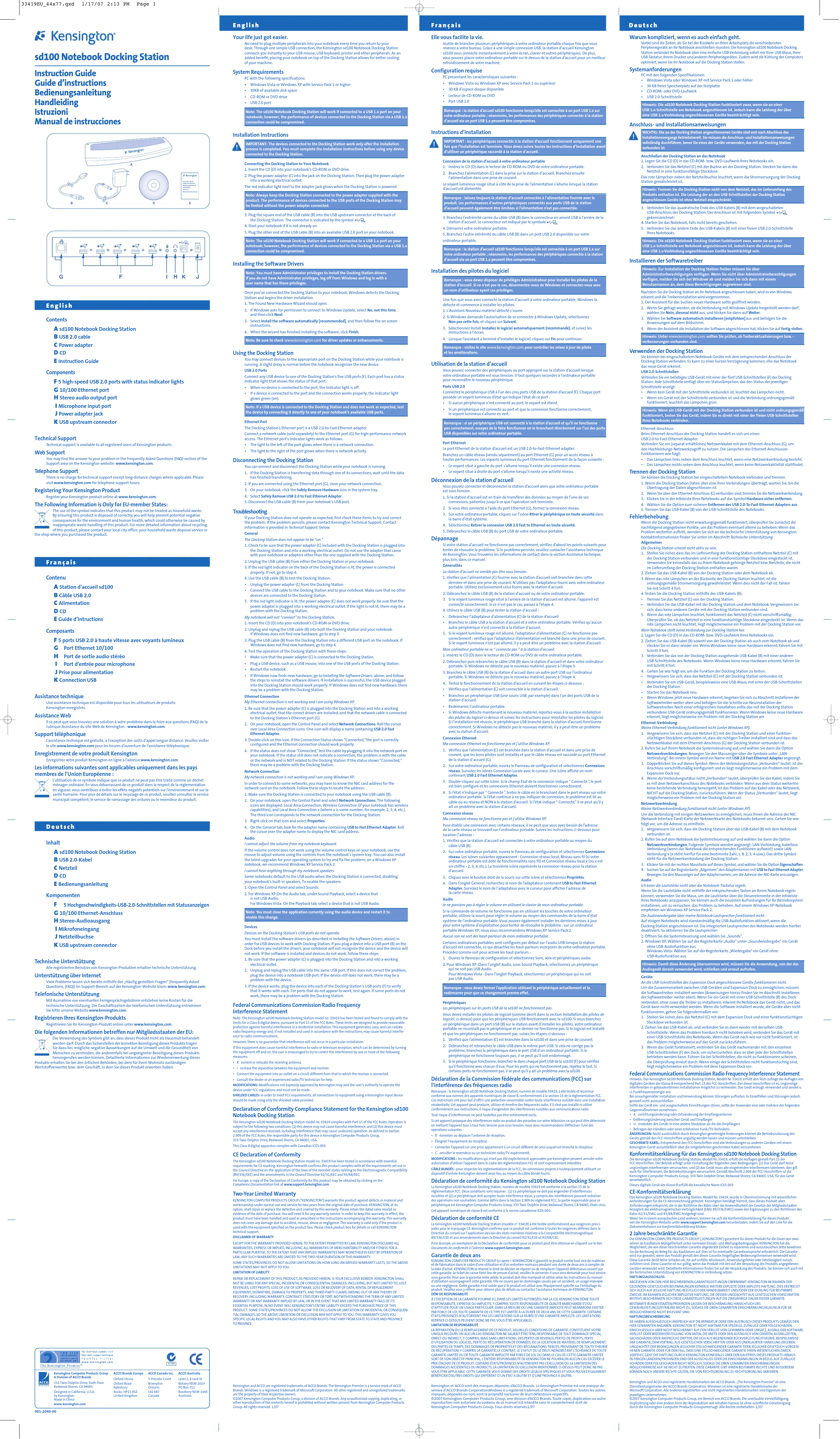 - Consulter le revendeur ou un technicien radio/TV expérimenté. MODIFICATIONS : les modifications qui n’ont pas été explicitement approuvées par Kensington peuvent annuler votre autorisation d’utiliser l’appareil dans le cadre des réglementations FCC et sont expressément interdites. CÂBLE BLINDÉS : pour respecter les réglementations de la FCC, les connexions propres à toutéquipement utilisant un dispositif d’entrée Kensington doivent avoir lieu au moyen du câble blindé fourni. Déclaration de conformité du Kensington sd100 Notebook Docking Station La Kensington sd100 Notebook Docking Station, numéro de modèle 33419 est conforme à la section 15 de la réglementation FCC. Deux conditions sont requises : (1) Ce périphérique ne doit pas engendrer d’interférences nuisibles et (2) ce périphérique doit accepter toute interférence reçue, y compris des interférences pouvant entraîner des opérations non souhaitées. Comme défini dans la Section 2.909 du règlement FCC, la partie responsable pour ce périphérique est Kensington Computer Products Group, 333 Twin Dolphin Drive, Redwood Shores, CA 94065, Etats-Unis. Cet appareil numérique de classe B est conforme à la norme canadienne ICES-003. Déclaration de conformité CE La Kensington sd100 Notebook Docking Station (modèle n° 33419) a été testée conformément aux exigences princi- pales pour le marquage CE. Kensington confirme que ce produit est conforme à toutes les exigences définies dans la Directive du conseil sur l’application des lois des états membres relatives à la Compatibilité électromagnétique 89/336/CEE et aux amendements dans la Directive du conseil 92/31/CEE et 93/68/CEE. Pour l’europe, un exemplaire de la Déclaration de conformité pour ce produit peut être obtenue en cliquant sur le lien Documents de conformité à l’adresse www.support.kensington.com. Garantie de deux ans KENSINGTON COMPUTER PRODUCTS GROUP (ci-après « KENSINGTON ») garantit ce produit contre tout vice de matériau et de fabrication dans le cadre d’une utilisation et d’un entretien normaux pendant une durée de deux ans à compter de la date d’achat. KENSINGTON se réserve le droit de décider de réparer ou de remplacer l’appareil défectueux couvert par cette garantie. Le ticket de caisse tient lieu de preuve d’achat, veuillez le conserver. Il vous sera demandé pour tout service sous garantie. Pour que la garantie reste valide, le produit doit être manipulé et utilisé selon les instructions du manuel d’utilisation accompagnant cette garantie. Elle ne couvre pas les dommages causés par un accident, un usage impropre ou une négligence. Cette garantie n’est valide que si le produit est utilisé avec l’équipement spécifié sur l’emballage du produit. Veuillez vous y référer pour obtenir plus de détails ou contactez l’assistance technique de KENSINGTON.DÉNI DE RESPONSABILITÉÀ L’EXCEPTION DE LA GARANTIE FOURNIE ICI, DANS LES LIMITES AUTORISÉES PAR LA LOI, KENSINGTON DÉNIE TOUTE RESPONSABILITÉ, EXPRESSE OU IMPLICITE, Y COMPRIS TOUTE RESPONSABILITÉ DE QUALITÉ MARCHANDE ET/OU D’APTITUDE POUR UN USAGE PARTICULIER. DANS LA MESURE OÙ UNE GARANTIE IMPLICITE PEUT NÉANMOINS EXISTER PAR FORCE DE LOI, TOUTE GARANTIE DE CE TYPE EST LIMITÉE À LA DURÉE DE DEUX ANS DE CETTE GARANTIE. CERTAINS ÉTATS/PROVINCES N’AUTORISENT PAS LES LIMITATIONS SUR LA DURÉE D’UNE GARANTIE IMPLICITE. LES LIMITATIONSREPRISES CI-DESSUS PEUVENT DONC NE PAS VOUS ÊTRE APPLICABLES.LIMITATION DE RESPONSABILITÉLA RÉPARATION OU LE REMPLACEMENT DE CE PRODUIT, SELON LES CONDITIONS DE GARANTIE, CONSTITUENT VOTRE UNIQUE RECOURS. EN AUCUN CAS KENSINGTON NE SAURAIT ÊTRE TENU RESPONSABLE DE TOUT DOMMAGE SPÉCIAL, DIRECT OU INDIRECT, Y COMPRIS, MAIS SANS LIMITATIONS, DES PERTES DE REVENUS, PERTES DE PROFITS, PERTED’UTILISATION DU LOGICIEL, PERTE OU RÉCUPÉRATION DE DONNÉES, DE LA LOCATION DE MATÉRIEL DE REMPLACEMENT,DES PERTES DE TEMPS, DES DOMMAGES DE PROPRIÉTÉS ET DES RÉCLAMATIONS TIERCES, PROVENANT DE TOUTE THÉORIEDE RÉCUPÉRATION, Y COMPRIS LA GARANTIE, LE CONTRAT, LE STATUT OU LE DÉLIT. NONOBSTANT L’ÉCHÉANCE DE TOUTE GARANTIE LIMITÉE OU DE TOUTE GARANTIE IMPLICITE PAR FORCE DE LOI, OU DANS LE CAS OÙ CETTE GARANTIE LIMITÉE SORT DE SON OBJECTIF PRINCIPAL, L’ENTIÈRE RESPONSABILITÉ DE KENSINGTON NE POURRA EN AUCUN CAS EXCÉDER LE PRIX D’ACHAT DE CE PRODUIT. CERTAINS ÉTATS/PROVINCES N’AUTORISENT PAS L’EXCLUSION OU LA LIMITATION DES DOMMAGES ACCIDENTELS OU INDIRECTS, LA LIMITATION OU EXCLUSION MENTIONNÉE CI-DESSUS PEUT DONC NE PAS VOUS ÊTRE APPLICABLE. CETTE GARANTIE VOUS DONNE DES DROITS LÉGAUX SPÉCIFIQUES ET VOUS POUVEZ ÉGALEMENT BÉNÉFICIER D’AUTRES DROITS QUI DIFFÈRENT D’UN ÉTAT À L’AUTRE ET D’UNE PROVINCE À L’AUTRE. Kensington et ACCO sont des marques déposées d’ACCO Brands. La Kensington Promise est une marque de service d’ACCO Brands Corporation. Windows is a registered trademark of Microsoft Corporation. Toutes les autresmarques, déposées ou non, sont la propriété exclusive de leurs détenteurs respectifs. ©2007 Kensington Computer Products Group, une division d’ACCO Brands. Toute copie, duplication ou autre reproduction non autorisée du contenu de ce manuel est interdite sans le consentement écrit de Kensington Computer Products Group. Tous droits réservés. 1/07 Français Warum kompliziert, wenn es auch einfach geht. Vorbei sind die Zeiten, als Sie bei der Rückkehr an Ihren Arbeitsplatz die verschiedensten Peripheriegeräte an Ihr Notebook anschließen mussten. Die Kensington sd100 Notebook Docking Station verbindet Ihr Notebook über eine einfache USB-Verbindung sofort mir Ihrer USB-Maus, Ihrer USB-Tastatur, Ihrem Drucker und anderen Peripheriegeräten. Zudem wird die Kühlung des Computers optimiert, wenn Sie Ihr Notebook auf die Docking Station stellen. Systemanforderungen PC mit den folgenden Spezifikationen: Windows Vista