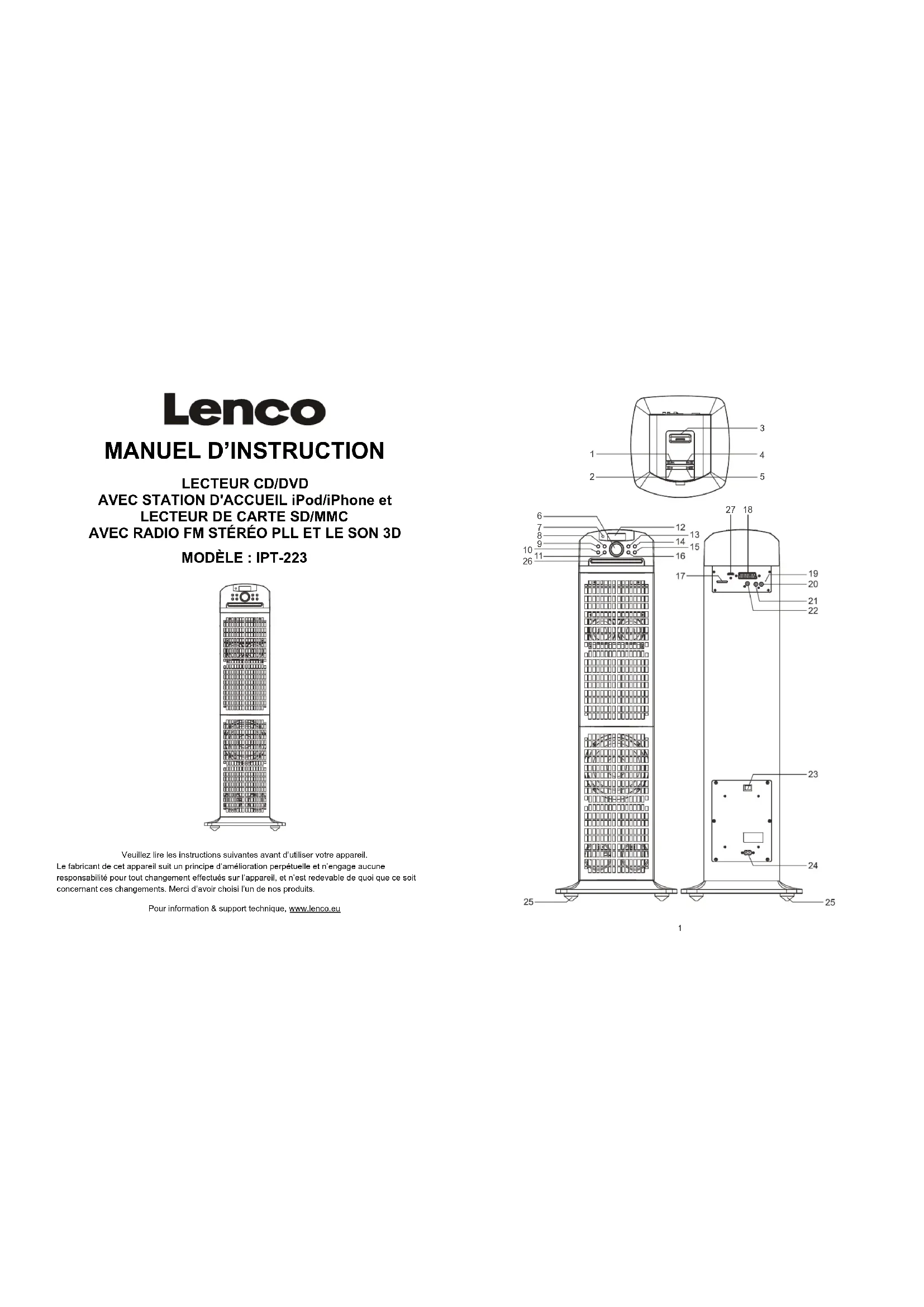 Veuillez lire les instructions suivantes avant d’utiliser votre appareil. Le fabricant de cet appareil suit un principe d’amélioration perpétuelle et n’engage aucune responsabilité pour tout changement effectués sur l’appareil, et n’est redevable de quoi que ce soit concernant ces changements. Merci d’avoir choisi l’un de nos produits. Pour information & support technique, www.lenco.eu