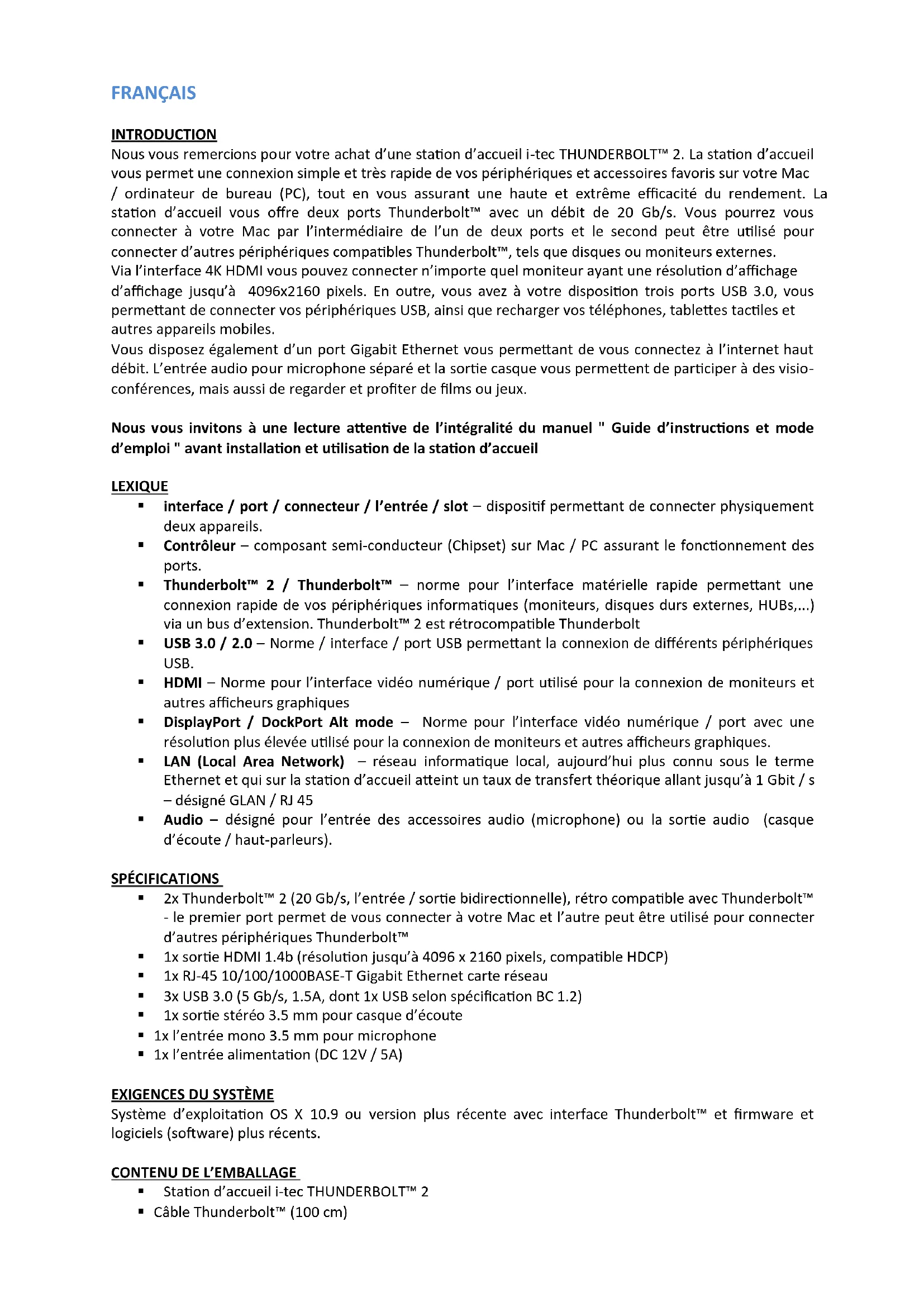 Frage: Welche Anforderungen müssen primäre Grafikkarten für die Verwendung mit Chipsätzen in der i-tec THUNDERBOLT™ 2 Docking Station erfüllen? Antwort: Wir empfehlen Mac mit Intel i5 und höher für überwiegend Büroarbeit und Intel i7 für Abspielen eines Videos. Frage: Wo kann ich die Verbindung der i-tec THUNDERBOLT™ 2 und anderen angeschlossenen Peripherien unter Mac überprüfen? Antwort: Nach dem Anschluss der Docking Station an Thunderbolt™ Port von Mac ist es möglich den Verbindungszustand unter: Über diesen Mac-Systemprofil-Hardware-Thunderbolt zu überprüfen. Angezeigt werden die Parameter von Thunderbolt™ Port sowohl von Mac als auch von Docking Station. Der Anschluss anderer Peripherien ist hier zu überprüfen: Für GLAN: Über diesen Mac-Systemprofil-Hardware-Ethernet-Karten Für USB: Über diesen Mac-Systemprofil-Hardware-USB Für HDMI Bildschirm: Über diesen Mac-Systemprofil-Hardware-Grafik/Bildschirme Frage: Ich verwende Mac OS X und der Audioausgang funktioniert nicht. Antwort: Tonausgangsgerät für Kopfhörer, die an die Docking Station angeschlossen sind, ist einzustellen /zu überprüfen unter: Systemeinstellungen-Ton-Ausgang einzustellen / zu überprüfen – USB Advanced Audio Device auswählen. Der überwiegende Teil von Problemen mit der Docking Station und den angeschlossenen Peripherien kann durch das Trennen des Thunderbolt™ Kabels der Docking Station von Thunderbolt™ Port von Mac und seinem erneuten Anschluss nach etwa 10 Sekunden gelöst werden. Wenn im Lieferumfang ein Zubehör, das auf der Verpackung angegeben ist, fehlt, dann nehmen Sie bitte mit uns Kontakt unter E-Mail info@comdis.cz auf, damit wir Ihnen das fehlende Zubehör zuschicken können. Vergessen Sie bitte nicht, die Lieferadresse anzugeben.FRANÇAIS INTRODUCTION Nous vous remercions pour votre achat d’une station d’accueil i-tec THUNDERBOLT™ 2. La station d’accueil vous permet une connexion simple et très rapide de vos périphériques et accessoires favoris sur votre Mac / ordinateur de bureau (PC), tout en vous assurant une haute et extrême efficacité du rendement. La station d’accueil vous offre deux ports Thunderbolt™ avec un débit de 20 Gb/s. Vous pourrez vous connecter à votre Mac par l’intermédiaire de l’un de deux ports et le second peut être utilisé pour connecter d’autres périphériques compatibles Thunderbolt™, tels que disques ou moniteurs externes. Via l’interface 4K HDMI vous pouvez connecter n’importe quel moniteur ayant une résolution d’affichage d’affichage jusqu’à 4096x2160 pixels. En outre, vous avez à votre disposition trois ports USB 3.0, vous permettant de connecter vos périphériques USB, ainsi que recharger vos téléphones, tablettes tactiles et autres appareils mobiles. Vous disposez également d’un port Gigabit Ethernet vous permettant de vous connectez à l’internet haut débit. L’entrée audio pour microphone séparé et la sortie casque vous permettent de participer à des visio- conférences, mais aussi de regarder et profiter de films ou jeux. Nous vous invitons à une lecture attentive de l’intégralité du manuel " Guide d’instructions et mode d’emploi " avant installation et utilisation de la station d’accueil LEXIQUE interface / port / connecteur / l’entrée / slot – dispositif permettant de connecter physiquement deux appareils. Contrôleur – composant semi-conducteur (Chipset) sur Mac / PC assurant le fonctionnement des ports. Thunderbolt™ 2 / Thunderbolt™ – norme pour l’interface matérielle rapide permettant une connexion rapide de vos périphériques informatiques (moniteurs, disques durs externes, HUBs,...) via un bus d’extension. Thunderbolt™ 2 est rétrocompatible Thunderbolt USB 3.0 / 2.0 – Norme / interface / port USB permettant la connexion de différents périphériques USB. HDMI – Norme pour l’interface vidéo numérique / port utilisé pour la connexion de moniteurs et autres afficheurs graphiques DisplayPort / DockPort Alt mode – Norme pour l’interface vidéo numérique / port avec une résolution plus élevée utilisé pour la connexion de moniteurs et autres afficheurs graphiques. LAN (Local Area Network) – réseau informatique local, aujourd’hui plus connu sous le terme Ethernet et qui sur la station d’accueil atteint un taux de transfert théorique allant jusqu’à 1 Gbit / s – désigné GLAN / RJ 45 Audio – désigné pour l’entrée des accessoires audio (microphone) ou la sortie audio (casque d’écoute / haut-parleurs). SPÉCIFICATIONS 2x Thunderbolt™ 2 (20 Gb/s, l’entrée / sortie bidirectionnelle), rétro compatible avec Thunderbolt™ - le premier port permet de vous connecter à votre Mac et l’autre peut être utilisé pour connecter d’autres périphériques Thunderbolt™ 1x sortie HDMI 1.4b (résolution jusqu’à 4096 x 2160 pixels, compatible HDCP) 1x RJ-45 10/100/1000BASE-T Gigabit Ethernet carte réseau 3x USB 3.0 (5 Gb/s, 1.5A, dont 1x USB selon spécification BC 1.2) 1x sortie stéréo 3.5 mm pour casque d’écoute 1x l’entrée mono 3.5 mm pour microphone 1x l’entrée alimentation (DC 12V / 5A)