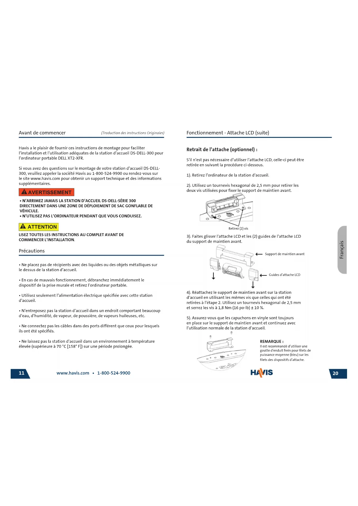 Havis a le plaisir de fournir ces instructions de montage pour faciliter l’installation et l’utilisation adéquates de la station d’accueil DS-DELL-300 pour l’ordinateur portable DELL XT2-XFR. Si vous avez des questions sur le montage de votre station d’accueil DS-DELL- 300, veuillez appeler la société Havis au 1-800-524-9900 ou rendez-vous sur le site www.havis.com pour obtenir un support technique et des informations supplémentaires. Avant de commencer (Traduction des Instructions Originales)