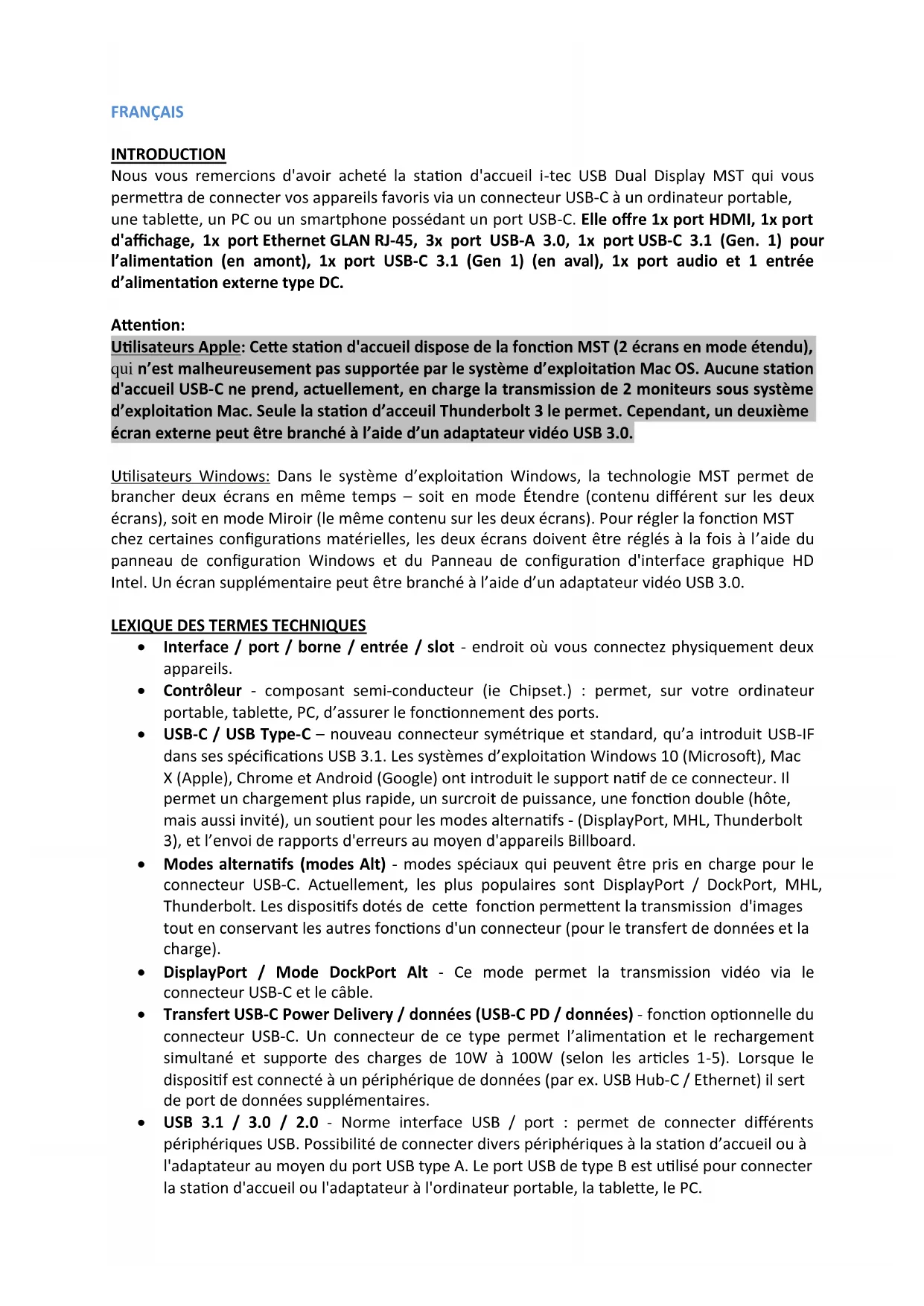 Nelaikykite ekstremalioje temperatūroje, saugokite nuo drėgmės. Įrenginius naudokite ant plokščių pagrindų – išvengsite slydimo ir kritimo ant grindų. Saugokite vadovą vėlesniam naudojimui. Kartu su serviso skyriumi: Patikrinkite ar įrenginys po įkritimo į vandenį ar kritimo ant žemės veikia. Suskilus dangčiui patikrinkite ar įrenginys veikia. Jeigu įrenginys neveikia pagal vartotojo vadovą, pareikškite pretenzijas.FRANÇAIS INTRODUCTION Nous vous remercions d'avoir acheté la station d'accueil i-tec USB Dual Display MST qui vous permettra de connecter vos appareils favoris via un connecteur USB-C à un ordinateur portable, une tablette, un PC ou un smartphone possédant un port USB-C. Elle offre 1x port HDMI, 1x port d'affichage, 1x port Ethernet GLAN RJ-45, 3x port USB-A 3.0, 1x port USB-C 3.1 (Gen. 1) pour l’alimentation (en amont), 1x port USB-C 3.1 (Gen 1) (en aval), 1x port audio et 1 entrée d’alimentation externe type DC. Attention: Utilisateurs Apple: Cette station d'accueil dispose de la fonction MST (2 écrans en mode étendu), qui n’est malheureusement pas supportée par le système d’exploitation Mac OS. Aucune station d'accueil USB-C ne prend, actuellement, en charge la transmission de 2 moniteurs sous système d’exploitation Mac. Seule la station d’acceuil Thunderbolt 3 le permet. Cependant, un deuxième écran externe peut être branché à l’aide d’un adaptateur vidéo USB 3.0. Utilisateurs Windows: Dans le système d’exploitation Windows, la technologie MST permet de brancher deux écrans en même temps – soit en mode Étendre (contenu différent sur les deux écrans), soit en mode Miroir (le même contenu sur les deux écrans). Pour régler la fonction MST chez certaines configurations matérielles, les deux écrans doivent être réglés à la fois à l’aide du panneau de configuration Windows et du Panneau de configuration d'interface graphique HD Intel. Un écran supplémentaire peut être branché à l’aide d’un adaptateur vidéo USB 3.0.