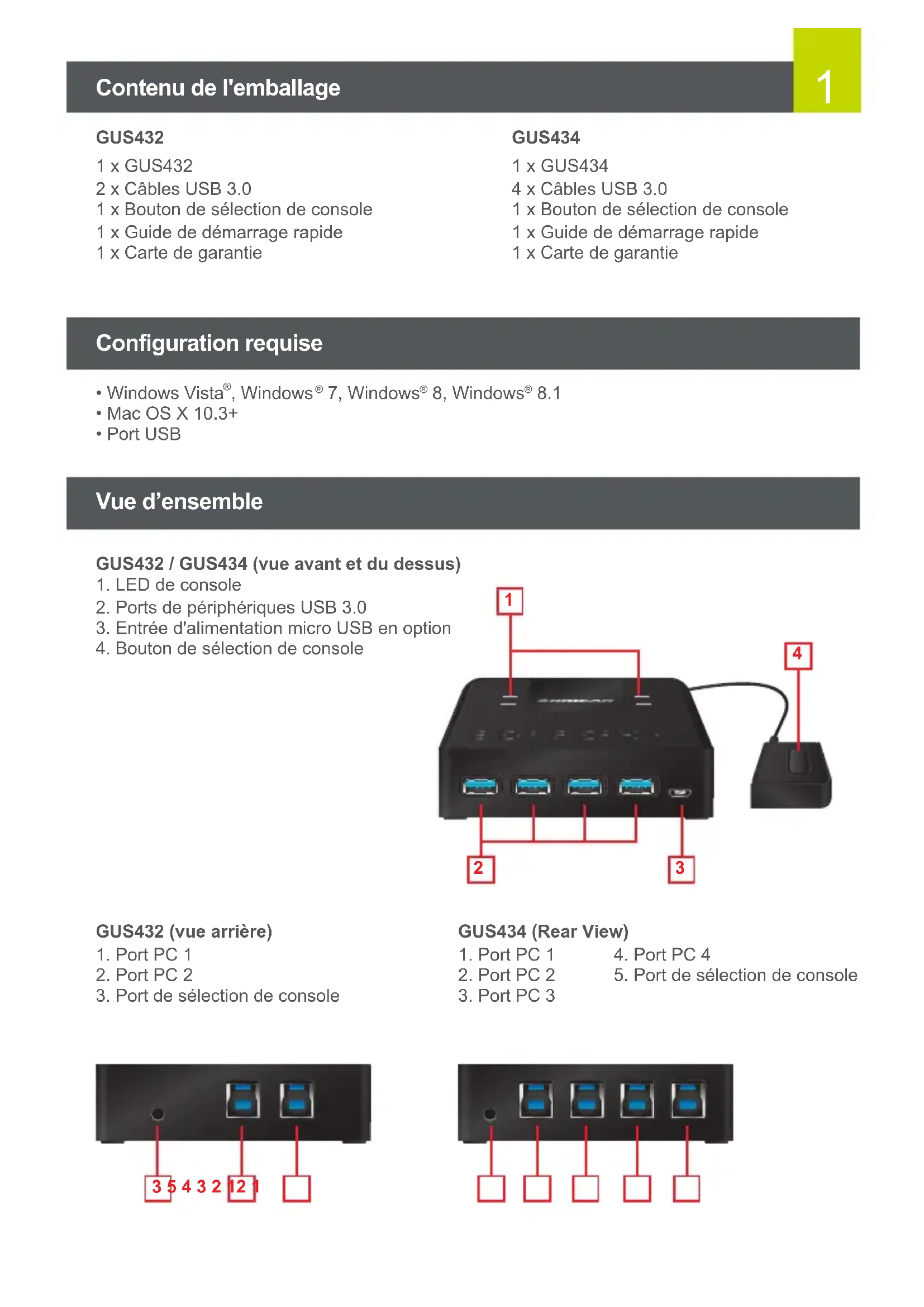 Renseignements sur la garantie Ce produit comporte une garantie limitée de 3 ans. Pour connaître les modalités de cette garantie,veuillez aller à http://www.iogear.com/support/warranty Inscrivez-vous en ligne à http://www.iogear.com/register Renseignements importants sur le produit Modèle du produit Numéro de série Cet appareil a été testé et déclaré conforme aux limites pour appareils numériques de Classe B, conformément à la partie 15 des règles de la FCC. Ces limites sont conçues pour fournir une protection raisonnable contre les interférences nuisibles dans une installation résidentielle. Cet appareil génère, utilise et peut émettre de l'énergie de fréquence radio et, s'il n'est pas installé et utilisé selon les instructions, il peut causer des interférences nuisibles aux communications radio. Cet appareil a été testé et trouvé conforme aux directives de l'Union européenne: Capacités électromagnétiques (2004/108/EC), basse tension (2006/95/EC) et R&TTED (1999/5/EC).1 GUS432 1 x GUS432 2 x Cables USB 3.0 1 x Botón de selección de consola 1 x Guía rápida de inicio 1 x Tarjeta de garantía GUS434 1 x GUS434 4 x Cables USB 3.0 1 x Botón de selección de consola 1 x Guía rápida de inicio 1 x Tarjeta de garantía Contenido del paquete