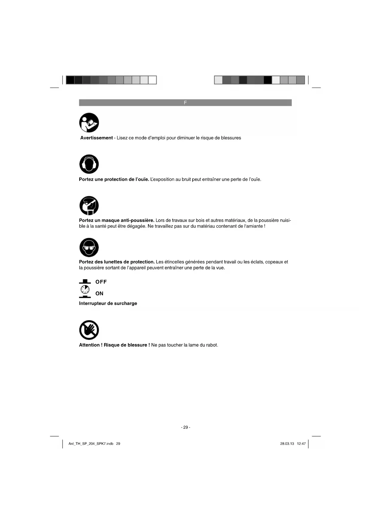 Attention! Risque de blessure! Ne pas toucher la lame du rabot.
