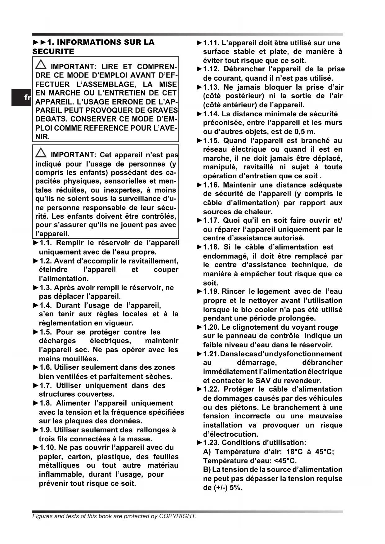 IMPORTANT: Cet appareil n’est pas indiqué pour l’usage de personnes (y compris les enfants) possédant des ca- pacités physiques, sensorielles et men- tales réduites, ou inexpertes, à moins qu’ils ne soient sous la surveillance d’u- ne personne responsable de leur sécu- rité. Les enfants doivent être contrôlés, pour s’assurer qu’ils ne jouent pas avec l’appareil. ►1.1. Remplir le réservoir de l’appareil uniquement avec de l’eau propre. ►1.2. Avant d’accomplir le ravitaillement, éteindre l’appareil et couper l’alimentation. ►1.3. Après avoir rempli le réservoir, ne pas déplacer l’appareil. ►1.4. Durant l’usage de l’appareil, s’en tenir aux règles locales et à la règlementation en vigueur. ►1.5. Pour se protéger contre les décharges électriques, maintenir l’appareil sec. Ne pas opérer avec les mains mouillées. ►1.6. Utiliser seulement dans des zones bien ventilées et parfaitement sèches. ►1.7. Utiliser uniquement dans des structures couvertes. ►1.8. Alimenter l’appareil uniquement avec la tension et la fréquence spéciées sur les plaques des données. ►1.9. Utiliser seulement des rallonges à trois ls connectées à la masse. ►1.10. Ne pas couvrir l’appareil avec du papier, carton, plastique, des feuilles métalliques ou tout autre matériau inammable, durant l’usage, pour prévenir tout risque ce soit. ►1.11. L’appareil doit être utilisé sur une surface stable et plate, de manière à éviter tout risque que ce soit. ►1.12. Débrancher l’appareil de la prise de courant, quand il n’est pas utilisé. ►1.13. Ne jamais bloquer la prise d’air (côté postérieur) ni la sortie de l’air (côté antérieur) de l’appareil. ►1.14. La distance minimale de sécurité préconisée, entre l’appareil et les murs ou d’autres objets, est de 0,5 m. ►1.15. Quand l’appareil est branché au réseau électrique ou quand il est en marche, il ne doit jamais être déplacé, manipulé, ravitaillé ni sujet à toute opération d’entretien que ce soit . ►1.16. Maintenir une distance adéquate de sécurité de l’appareil (y compris le câble d’alimentation) par rapport aux sources de chaleur. ►1.17. Quoi qu’il en soit faire ouvrir et/ ou réparer l’appareil uniquement par le centre d’assistance autorisé. ►1.18. Si le câble d’alimentation est endommagé, il doit être remplacé par le centre d’assistance technique, de manière à empêcher tout risque que ce soit. ►1.19. Rincer le logement avec de l’eau propre et le nettoyer avant l’utilisation lorsque le bio cooler n’a pas été utilisé pendant une période prolongée. ►1.20. Le clignotement du voyant rouge sur le panneau de contrôle indique un faible niveau d’eau dans le réservoir. ►1.21. Dans le cas d’un dysfonctionnement au démarrage, débrancher immédiatement l’alimentation électrique et contacter le SAV du revendeur. ►1.22. Protéger le câble d’alimentation de dommages causés par des véhicules ou des piétons. Le branchement à une tension incorrecte ou une mauvaise installation va provoquer un risque d’électrocution. ►1.23. Conditions d’utilisation: A) Température d’air: 18°C à 45°C; Température d’eau: <45°C. B) La tension de la source d’alimentation ne peut pas dépasser la tension requise de (+/-) 5%. Figures and texts of this book are protected by COPYRIGHT.fr C) L’entrée d’air doit être exempte de poussière, saleté, ou, si nécessaire, procéder à un nettoyage supplémentaire. ►►2. DESEMBALLAGE ►2.1. Enlever tous les matériaux d’emballage utilisés pour conditionner et expédier l’appareil et les éliminer selon les règlementations en vigueur. ►2.2. Extraire tous les articles de l’emballage. ►2.3. Contrôler les dommages éventuels subis durant le transport. Si l’appareil apparait endommagé, en informer immédiatement le concessionnaire chez lequel il a été acheté. ►►3. ASSEMBLAGE L’appareil est doté de roues pour faciliter la manutention. Selon le modèle, les roues peuvent être déjà installées, ou bien elles devront être montées. Les composants, dotés de la boulonnerie de montage correspondante, sont situés à l’intérieur de l’emballage (Fig. 1). ►►4. FONCTIONNEMENT MISE EN GARDE: Lire attentivement les “INFORMATIONS SUR LA SECURITE”, avant d’allumer l’appareil. MISE EN GARDE: Utiliser uniquement de l’eau propre, pour éviter des dommages ou d’autres anomalies. MISE EN GARDE: Vérier la juste mise à la terre de votre installation électrique. Le branchement au réseau électrique doit avoir lieu conformément aux règlementations nationales en vigueur. Alimenter l’appareil uniquement avec la tension et la fréquence spéciées sur les plaques des données. REMARQUE: Ces modèles peuvent être connectés à la connexion d’alimentation en eau, en reliant le tuyau raccord (Fig. 10). ►►4.1. ALLUMAGE: ►4.1.1. Ouvrir le volet du réservoir (Fig. 2). ►4.1.2. Remplir d’eau le réservoir (Fig. 3), le niveau de l’eau doit être compris entre MIN et MAX de l’échelle graduée, placée sur le côté de l’appareil (Fig. 4), pour éviter les risques. ►4.1.3. Fermer le volet du réservoir (Fig. 5). ►4.1.4. Brancher la che d’alimentation au réseau électrique (Fig. 6). ►4.1.5. Presser le bouton ON/OFF pour allumer l’appareil (Fig. 9). ►►4.2. PANNEAU DE CONTROLE,