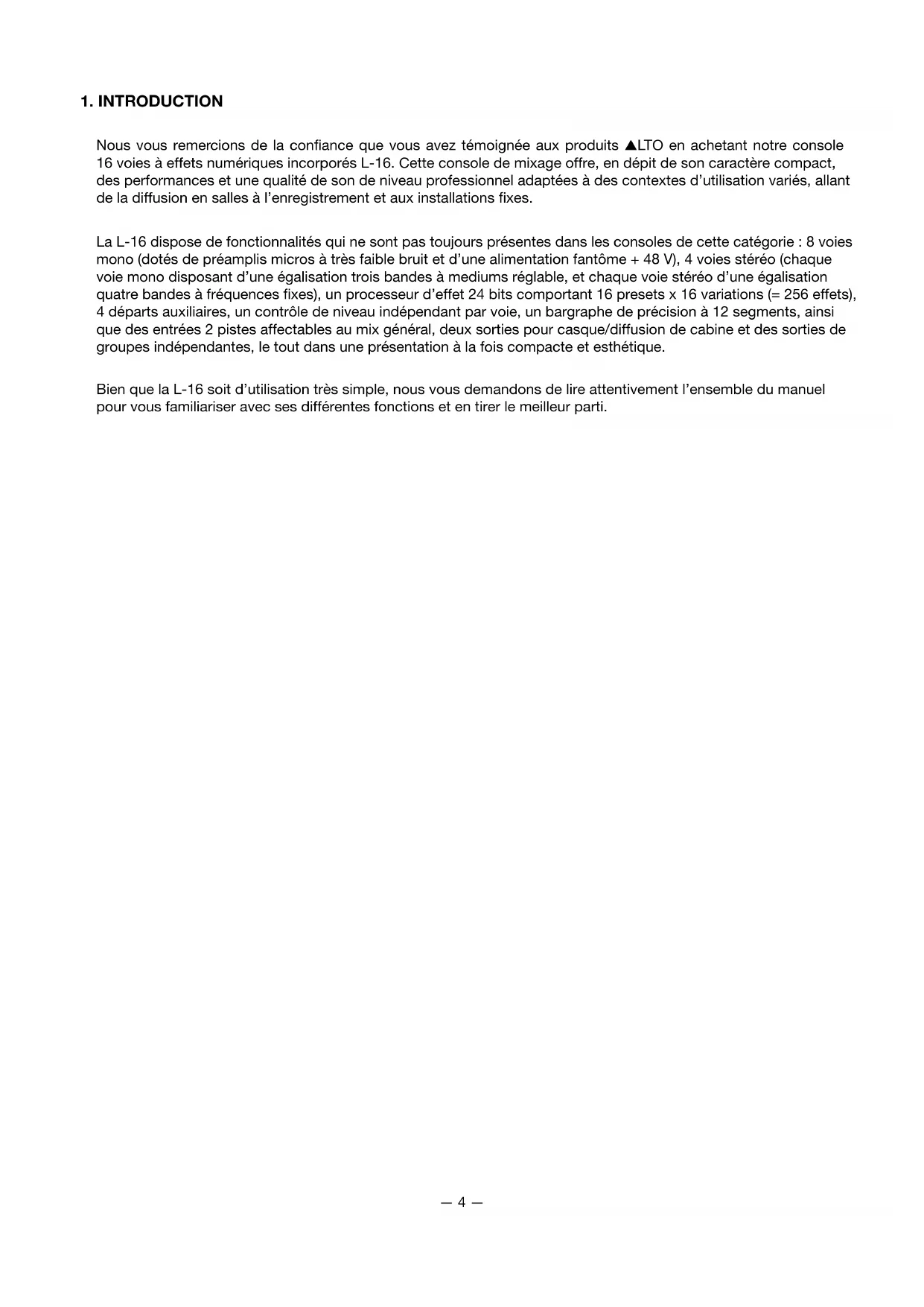 Nous vous remercions de la conance que vous avez témoignée aux produits ▲LTO en achetant notre console 16 voies à effets numériques incorporés L-16. Cette console de mixage offre, en dépit de son caractère compact, des performances et une qualité de son de niveau professionnel adaptées à des contextes d’utilisation variés, allant de la diffusion en salles à l’enregistrement et aux installations xes. La L-16 dispose de fonctionnalités qui ne sont pas toujours présentes dans les consoles de cette catégorie : 8 voies mono (dotés de préamplis micros à très faible bruit et d’une alimentation fantôme + 48 V), 4 voies stéréo (chaque voie mono disposant d’une égalisation trois bandes à mediums réglable, et chaque voie stéréo d’une égalisation quatre bandes à fréquences xes), un processeur d’effet 24 bits comportant 16 presets x 16 variations (= 256 effets), 4 départs auxiliaires, un contrôle de niveau indépendant par voie, un bargraphe de précision à 12 segments, ainsi que des entrées 2 pistes affectables au mix général, deux sorties pour casque/diffusion de cabine et des sorties de groupes indépendantes, le tout dans une présentation à la fois compacte et esthétique. Bien que la L-16 soit d’utilisation très simple, nous vous demandons de lire attentivement l’ensemble du manuel pour vous familiariser avec ses différentes fonctions et en tirer le meilleur parti.— 5 —