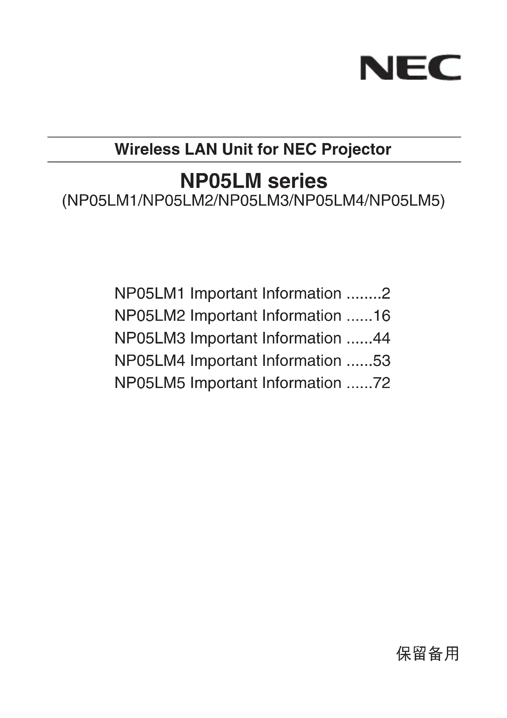 Retrouvez gratuitement la notice de l'appareil NP05LM1 NEC au format PDF.