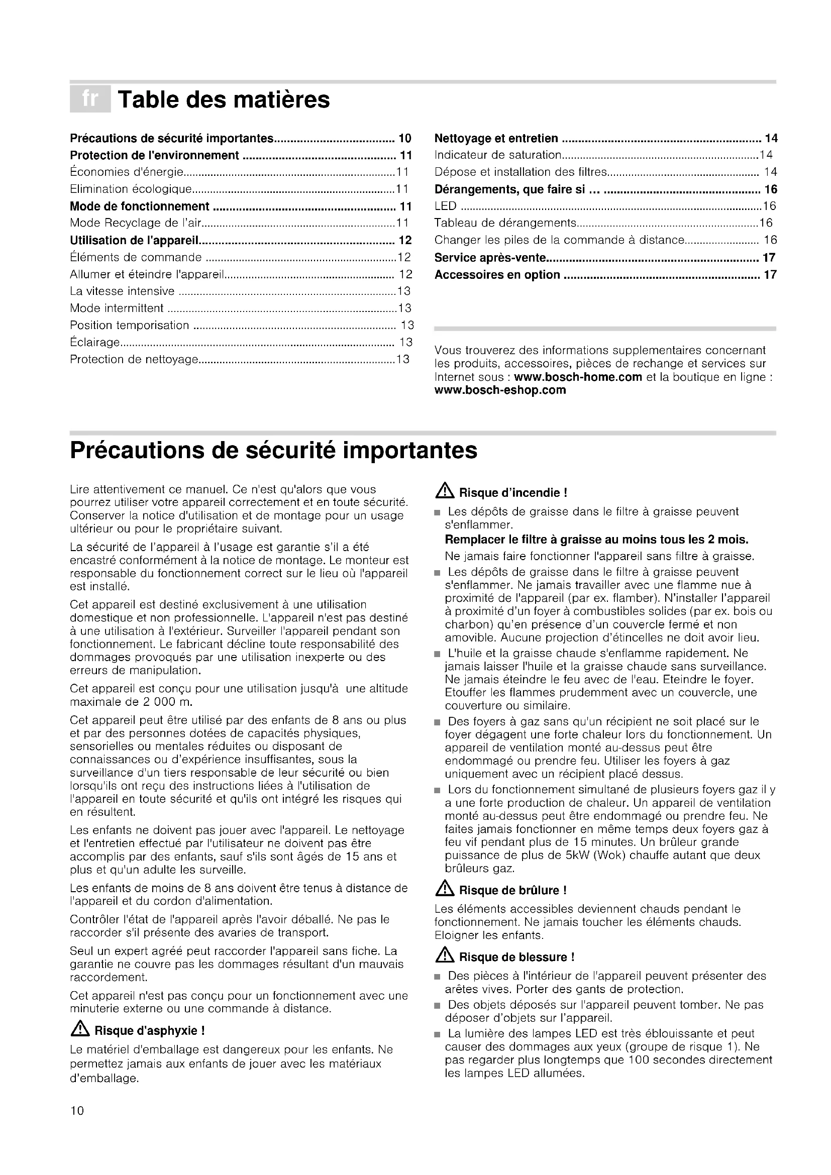 - Accessoires en option Produktinfo Vous trouverez des informations supplementaires concernant les produits, accessoires, pièces de rechange et services sur Internet sous : www.bosch-home.com et la boutique en ligne : www.bosch-eshop.com Précautions de sécurité importantes Lire attentivement ce manuel. Ce n'est qu'alors que vous pourrez utiliser votre appareil correctement et en toute sécurité. Conserver la notice d'utilisation et de montage pour un usage ultérieur ou pour le propriétaire suivant. La sécurité de l’appareil à l’usage est garantie s’il a été encastré conformément à la notice de montage. Le monteur est responsable du fonctionnement correct sur le lieu où l'appareil est installé. Cet appareil est destiné exclusivement à une utilisation domestique et non professionnelle. L'appareil n'est pas destiné à une utilisation à l'extérieur. Surveiller l'appareil pendant son fonctionnement. Le fabricant décline toute responsabilité des dommages provoqués par une utilisation inexperte ou des erreurs de manipulation. Cet appareil est conçu pour une utilisation jusqu'à une altitude maximale de 2 000 m. Cet appareil peut être utilisé par des enfants de 8 ans ou plus et par des personnes dotées de capacités physiques, sensorielles ou mentales réduites ou disposant de connaissances ou d’expérience insuffisantes, sous la surveillance d'un tiers responsable de leur sécurité ou bien lorsqu'ils ont reçu des instructions liées à l'utilisation de l'appareil en toute sécurité et qu'ils ont intégré les risques qui en résultent. Les enfants ne doivent pas jouer avec l'appareil. Le nettoyage et l'entretien effectué par l'utilisateur ne doivent pas être accomplis par des enfants, sauf s'ils sont âgés de 15 ans et plus et qu'un adulte les surveille. Les enfants de moins de 8 ans doivent être tenus à distance de l'appareil et du cordon d'alimentation. Contrôler l'état de l'appareil après l'avoir déballé. Ne pas le raccorder s'il présente des avaries de transport. Seul un expert agréé peut raccorder l'appareil sans fiche. La garantie ne couvre pas les dommages résultant d'un mauvais raccordement. Cet appareil n'est pas conçu pour un fonctionnement avec une minuterie externe ou une commande à distance. : Risque d'asphyxie ! Le matériel d'emballage est dangereux pour les enfants. Ne permettez jamais aux enfants de jouer avec les matériaux d’emballage. : Risque d’incendie ! ■ Les dépôts de graisse dans le filtre à graisse peuvent s'enflammer. Remplacer le filtre à graisse au moins tous les 2 mois. Ne jamais faire fonctionner l'appareil sans filtre à graisse. Risque d'incendie !■ Les dépôts de graisse dans le filtre à graisse peuvent s'enflammer. Ne jamais travailler avec une flamme nue à proximité de l'appareil (par ex. flamber). N’installer l’appareil à proximité d’un foyer à combustibles solides (par ex. bois ou charbon) qu’en présence d’un couvercle fermé et non amovible. Aucune projection d’étincelles ne doit avoir lieu. Risque d'incendie !■ L'huile et la graisse chaude s'enflamme rapidement. Ne jamais laisser l'huile et la graisse chaude sans surveillance. Ne jamais éteindre le feu avec de l'eau. Eteindre le foyer. Etouffer les flammes prudemment avec un couvercle, une couverture ou similaire. Risque d'incendie !■ Des foyers à gaz sans qu'un récipient ne soit placé sur le foyer dégagent une forte chaleur lors du fonctionnement. Un appareil de ventilation monté au-dessus peut être endommagé ou prendre feu. Utiliser les foyers à gaz uniquement avec un récipient placé dessus. Risque d'incendie !■ Lors du fonctionnement simultané de plusieurs foyers gaz il y a une forte production de chaleur. Un appareil de ventilation monté au-dessus peut être endommagé ou prendre feu. Ne faites jamais fonctionner en même temps deux foyers gaz à feu vif pendant plus de 15 minutes. Un brûleur grande puissance de plus de 5kW (Wok) chauffe autant que deux brûleurs gaz. : Risque de brûlure ! Les éléments accessibles deviennent chauds pendant le fonctionnement. Ne jamais toucher les éléments chauds. Eloigner les enfants. : Risque de blessure ! ■ Des pièces à l'intérieur de l'appareil peuvent présenter des arêtes vives. Porter des gants de protection. Risque de blessure !■ Des objets déposés sur l'appareil peuvent tomber. Ne pas déposer d’objets sur l’appareil. Risque de blessure !■ La lumière des lampes LED est très éblouissante et peut causer des dommages aux yeux (groupe de risque 1). Ne pas regarder plus longtemps que 100 secondes directement les lampes LED allumées.11 : Risque de choc électrique ! ■ Un appareil défectueux peut provoquer un choc électrique. Ne jamais mettre en service un appareil défectueux. Débrancher la fiche secteur ou enlever le fusible dans le boîtier à fusibles. Appeler le service après-vente. Risque de choc électrique ! ■ Tenter de réparer vous-même l'appareil est dangereux. Seul un technicien du service après-vente formé par nos soins est habilité à effectuer des réparations et à remplacer des câbles d'alimentation défectueux. Si l'appareil est défectueux, débrancher la fiche secteur ou enlever le fusible dans le boîtier à fusibles. Appeler le service après-vente. Risque de choc électrique ! ■ De l'humidité qui pénètre peut occasionner un choc électrique. Ne pas utiliser de nettoyeur haute pression ou de nettoyeur à vapeur. Causes de dommages Attention ! Risque de détérioration par la corrosion. Toujours allumer l'appareil pendant la cuisson afin d'éviter la formation de condensation. La condensation peut provoquer de la corrosion. Risque de détérioration par pénétration d'humidité dans l'électronique. Ne jamais nettoyer les éléments de commande avec un chiffon mouillé. Les surfaces peuvent être endommagées par un nettoyage non conforme. Nettoyer les surfaces en inox seulement dans le sens du m