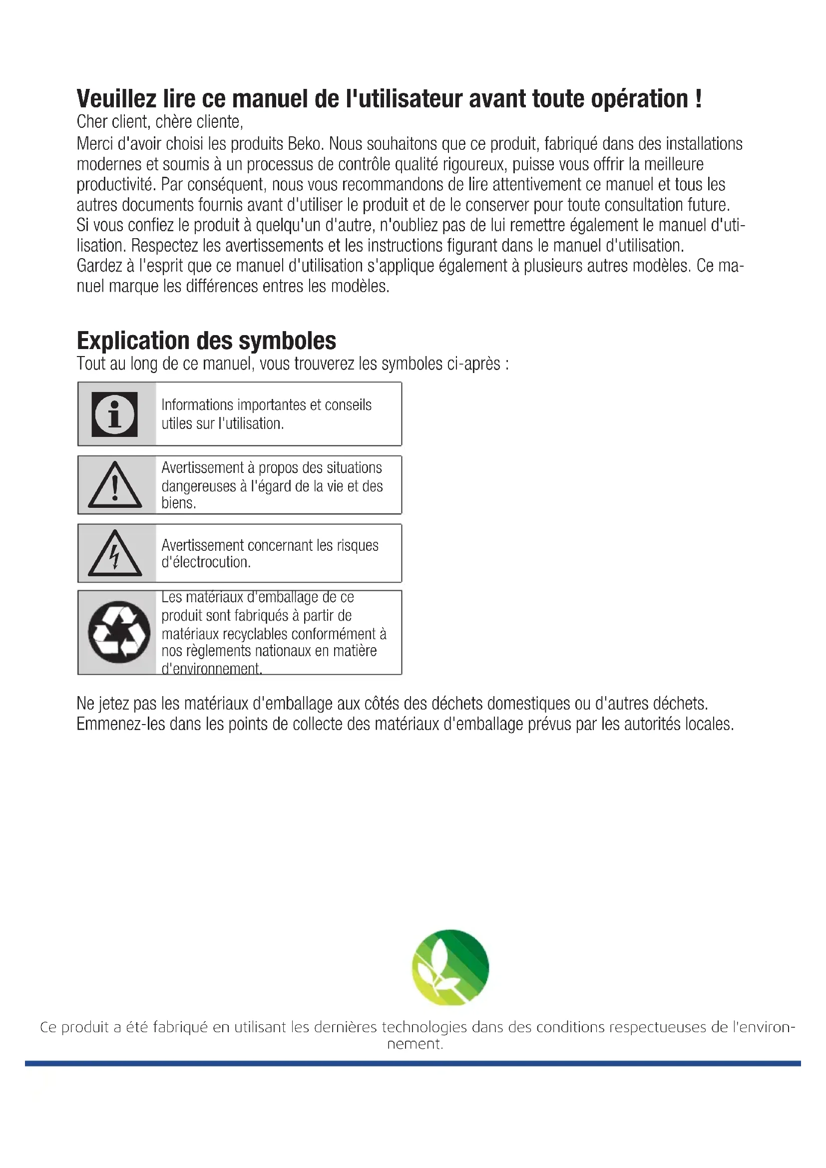 - Zum Austausch an den technischen Support wenden. („Zum Erwerb an den technischen Support wenden“)Veuillez lire ce manuel de l'utilisateur avant toute opération ! Cher client, chère cliente, Merci d'avoir choisi les produits Beko. Nous souhaitons que ce produit, fabriqué dans des installations modernes et soumis à un processus de contrôle qualité rigoureux, puisse vous offrir la meilleure productivité. Par conséquent, nous vous recommandons de lire attentivement ce manuel et tous les autres documents fournis avant d'utiliser le produit et de le conserver pour toute consultation future. Si vous confiez le produit à quelqu'un d'autre, n'oubliez pas de lui remettre également le manuel d'uti- lisation. Respectez les avertissements et les instructions figurant dans le manuel d'utilisation. Gardez à l'esprit que ce manuel d'utilisation s'applique également à plusieurs autres modèles. Ce ma- nuel marque les différences entres les modèles. Explication des symboles Tout au long de ce manuel, vous trouverez les symboles ci-après :