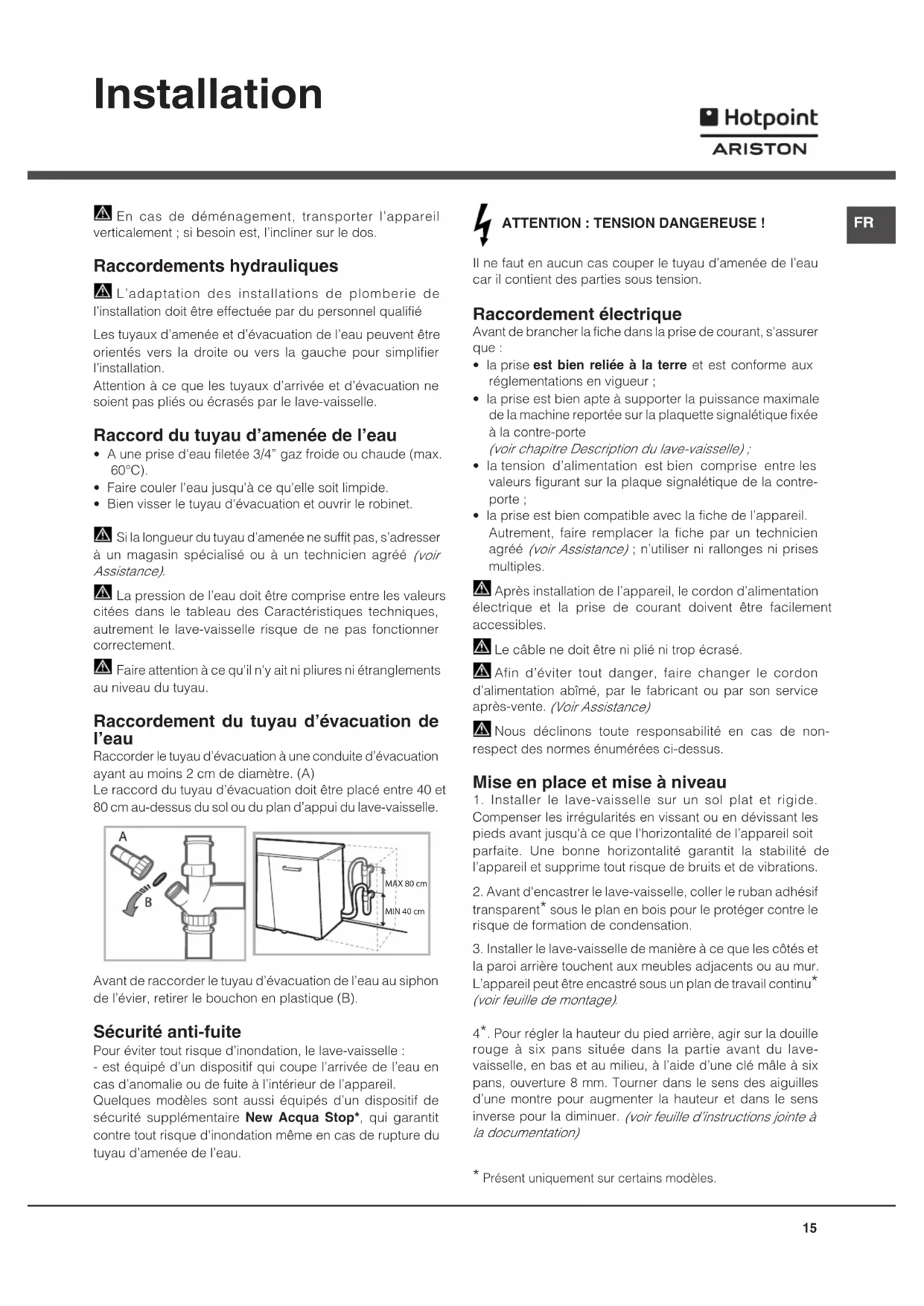 La pression de l’eau doit être comprise entre les valeurs citées dans le tableau des Caractéristiques techniques, autrement le lave-vaisselle risque de ne pas fonctionner correctement.Faire attention à ce qu'il n'y ait ni pliures ni étranglements au niveau du tuyau. Raccordement du tuyau d’évacuation de l’eau Raccorder le tuyau d’évacuation à une conduite d’évacuation ayant au moins 2 cm de diamètre. (A)Le raccord du tuyau d’évacuation doit être placé entre 40 et 80 cm au-dessus du sol ou du plan d’appui du lave-vaisselle.Avant de raccorder le tuyau d’évacuation de l’eau au siphon de l’évier, retirer le bouchon en plastique (B). Sécurité anti-fuite Pour éviter tout risque d’inondation, le lave-vaisselle :- est équipé d’un dispositif qui coupe l’arrivée de l’eau en cas d’anomalie ou de fuite à l’intérieur de l’appareil.Quelques modèles sont aussi équipés d’un dispositif de sécurité supplémentaire New Acqua Stop*, qui garantit contre tout risque d'inondation même en cas de rupture du tuyau d’amenée de l’eau. ATTENTION : TENSION DANGEREUSE ! Il ne faut en aucun cas couper le tuyau d’amenée de l’eau car il contient des parties sous tension. Raccordement électrique Avant de brancher la fiche dans la prise de courant, s'assurer que :• la prise est bien reliée à la terre et est conforme aux réglementations en vigueur ;• la prise est bien apte à supporter la puissance maximale de la machine reportée sur la plaquette signalétique fixée à la contre-porte (voir chapitre Description du lave-vaisselle) ;