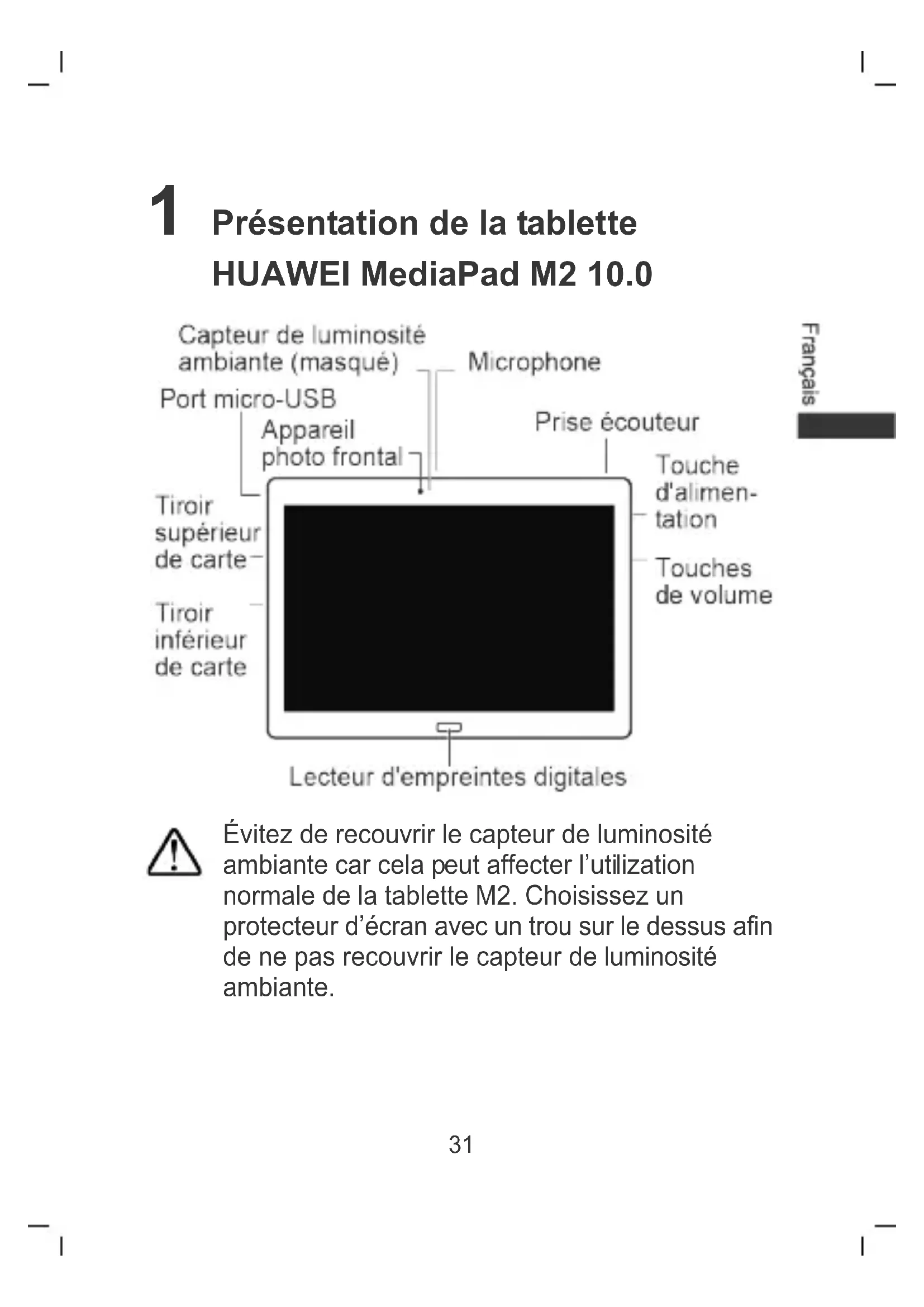 Shenzhen 2015-09-14 (Place) (Date) (Company stamp and legal signature)31 1 Présentation de la tablette HUAWEI MediaPad M2 10.0 Évitez de recouvrir le capteur de luminosité ambiante car cela peut affecter l’utilization normale de la tablette M2. Choisissez un protecteur d’écran avec un trou sur le dessus afin de ne pas recouvrir le capteur de luminosité ambiante.32 2 Insertion de la carte