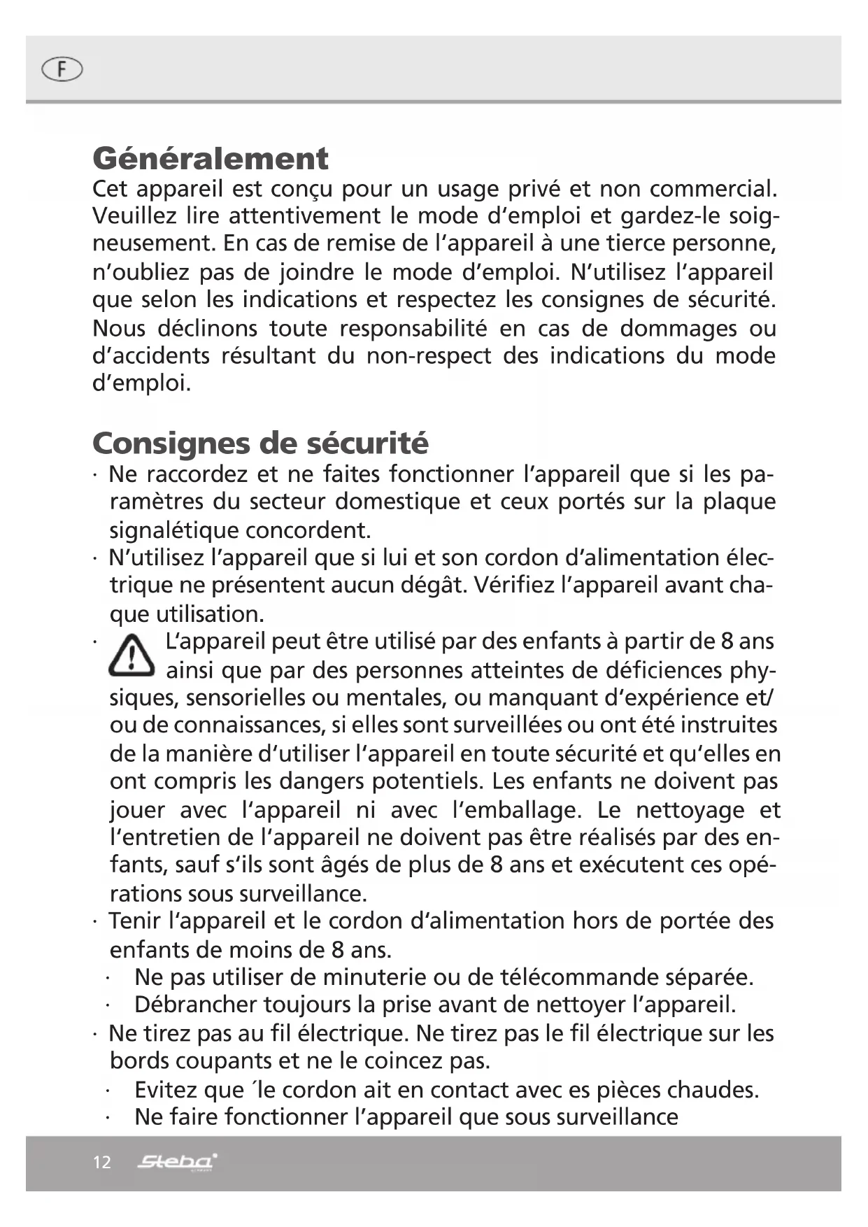 In this instance, the cheese is at the focal point of the raclette party. Plan about 200 to 250 grams of cheese and potatoes per person, and side-dishes as well. Place a slice of cheese about 5 mm (3/8th of an inch) thick in the pan, cut to fit, and push it in under the grill. Once the cheese has melted into a creamy mass, take the pan out and extract the cheese with the aid of a small wooden spatula and pour it onto boiled or foil potatoes, French bread, or toast. Cleaning ∙ Always pull the plug out of the socket before cleaning the appliance. ∙ Clean the appliance as soon as possible alter use, but allow the grill surface to cool down sufficiently first. Cleaning is easiest while the appliance is still fairly warm. To remove the grill surface, lift it up from underneath with one hand. Then you can take it out without any difficulty.11 Basic appliance: Use a damp cloth for cleaning. Never immerse the appliance in water. Make sure that no water finds its way inside the appliance. Observe the safety instructions as well. Gourmet pans: Soak the gourmet pans in water with a little washing-up liquid for a while to soften if necessary. Non-stick grill plate: The Non-stick grill plate can likewise be washed up in water and washing-up liquid, but is also perfectly suitable for a dish-washing machine. Gourmet stone plate: Soak the grill stone in hot water (with no additives!) for some time, and then clean it with clear, warm water and if necessary a cleaning sponge. Do not use any washing- up liquid or abrasive as these could affect the properties of the stone. The grill stone expands when heated. This can cause small, visible cracks to appear on the surface, but these do not affect its function. For this reason the stone is excluded from guarantee cover. Correct Disposal of this product This marking indicates that this product should not be disposed with other household wastes throughout the EU. To prevent possible harm to the environment or human health from uncontrolled waste disposal, recycle it responsibly to promote the sustainable reuse of material resources. To return your used device, please use the return and collection systems or contact the retailer where the product was purchased. They can take this product for environmental safe recycling. Packaging disposal: Do not throw away the package materials. Please put it in the recycling bin. Gift box: Paper, should be put to the old paper collection point. Plastic packaging material and foils should be collected in the special collection containers. Service and Repair: If the appliance must be repaired, please get in touch with your trader or with the manufacturer: STEBA Elektrogeräte GmbH & Co KG Pointstr. 2, 96129 Strullendorf / Germany Distribution-Tel.: 09543 / 449-17 / -18, Service-Tel.: 09543 / 449-44, Fax: 09543 / 449-19 e-Mail: elektro@steba.com Internet: http://www.steba.com12 Généralement Cet appareil est conçu pour un usage privé et non commercial. Veuillez lire attentivement le mode d‘emploi et gardez-le soig- neusement. En cas de remise de l‘appareil à une tierce personne, n’oubliez pas de joindre le mode d’emploi. N’utilisez l‘appareil que selon les indications et respectez les consignes de sécurité. Nous déclinons toute responsabilité en cas de dommages ou d’accidents résultant du non-respect des indications du mode d’emploi. Consignes de sécurité ∙ Ne raccordez et ne faites fonctionner l’appareil que si les pa- ramètres du secteur domestique et ceux portés sur la plaque signalétique concordent. ∙ N’utilisez l’appareil que si lui et son cordon d’alimentation élec- trique ne présentent aucun dégât. Vérifiez l’appareil avant cha- que utilisation. ∙ L‘appareil peut être utilisé par des enfants à partir de 8 ans ainsi que par des personnes atteintes de déficiences phy- siques, sensorielles ou mentales, ou manquant d‘expérience et/ ou de connaissances, si elles sont surveillées ou ont été instruites de la manière d‘utiliser l‘appareil en toute sécurité et qu‘elles en ont compris les dangers potentiels. Les enfants ne doivent pas jouer avec l‘appareil ni avec l‘emballage. Le nettoyage et l‘entretien de l‘appareil ne doivent pas être réalisés par des en- fants, sauf s‘ils sont âgés de plus de 8 ans et exécutent ces opé- rations sous surveillance. ∙ Tenir l‘appareil et le cordon d‘alimentation hors de portée des enfants de moins de 8 ans. ∙ Ne pas utiliser de minuterie ou de télécommande séparée. ∙ Débrancher toujours la prise avant de nettoyer l’appareil. ∙ Ne tirez pas au fil électrique. Ne tirez pas le fil électrique sur les bords coupants et ne le coincez pas. ∙ Evitez que ´le cordon ait en contact avec es pièces chaudes. ∙ Ne faire fonctionner l’appareil que sous surveillance13 ∙ Ne pas mettre quelque chose sur l’appareil. ∙ Ne gardez pas votre appareil dehors. ∙ Ne jamais plonger l’appareil dans l’eau. ∙ Ne pas mettre en service un appareil défectueux par example si l’appareil est tombé. ∙ Le fabricant n’est pas responsable pour des dommages éven- tuels dût à un mauvais emploi, autre emploi non conforme au appareil et mode d’emploi. ∙ Avant la première utilisation: Nettoyez toutes les pièces à fond sauf l’élément de chauffage. ∙ Attention! L´extérieur de l´appareil et la porte en verre deviennent chauds. Risque de brûlures. Ne pas déposez láppareil sur une surface sensible et le posez de sorte quíl ait au moins 70 cm de place libre des matié- res inflammables. ∙ Mise en service: Important! Préchauffer le four environ 10 min.