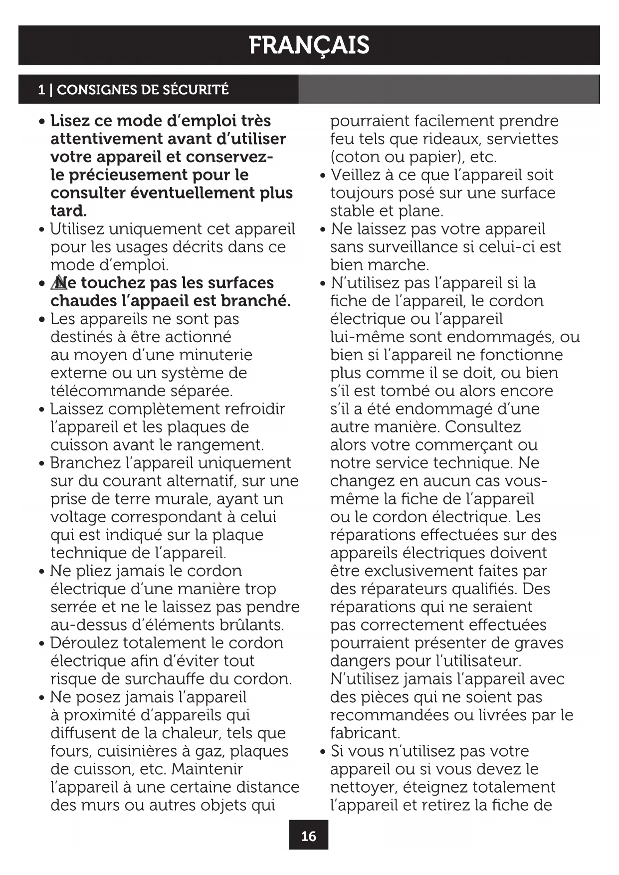 - Ne touchez pas les surfaces chaudes l’appaeil est branché.