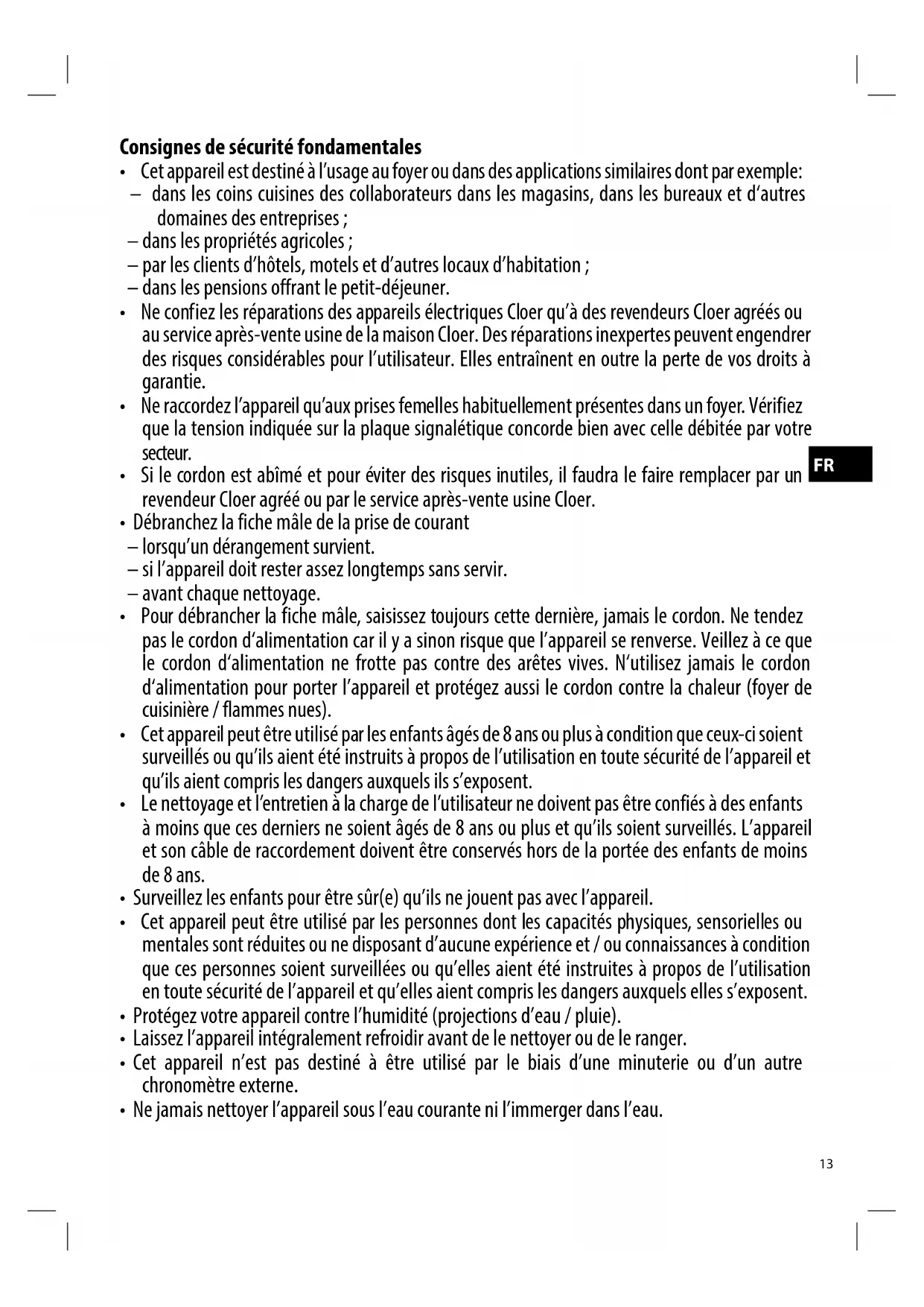 Les apparêils électriques correspondant aux directives actuelles et aux prescriptions en matière de sécurité de l'UE. Si vous appareil Cloer présente un dysfonctionnement, ou qu'il ne fonctionne pas correctement, veuilles consulter votre distributeur/agree ou le service après-vente d'usine de Cloer.